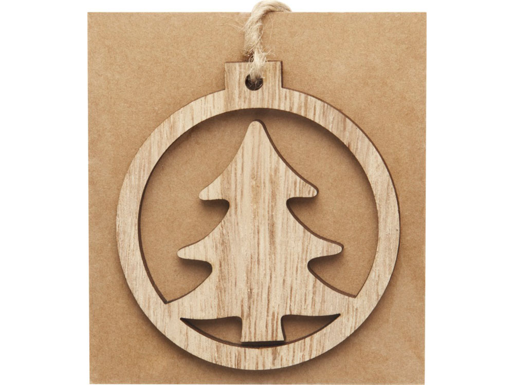 Деревянное украшение круглой формы с елкой внутри, с петлей и шнурком. Упаковано с открыткой из крафт-бумаги на обратной стороне.