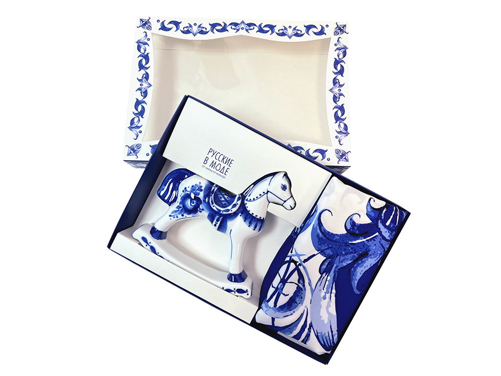 Гжель — популярный художественный промысел, символ России — яркая, самобытная и неповторимая. Платок Гжель от бренда Русские в моде выполнен в технике знаменитой кобальтовой росписи. Узоры в тонких оттенках синего цвета, размещенные на белом фоне, — один из самых распространенных рисунков гжель, чья форма столетиями доводилась мастерами до совершенства. На полотне восхитительные соцветия тугих бутонов и ажурных лепестков гармонично соседствуют с узнаваемыми сине-голубыми завитками, спиралями и линиями. Статуэтка Лошадка-качалка создана Объединением Гжель — всемирно известной фабрикой фарфора, который отличается качеством, долговечностью и красотой. Изысканное изделия Лошадка-качалка напомнит о волшебном мире детства, домашнем уюте и радости каждого дня. Фигурка выполнена из фарфора с ручной сине-белой росписью и воплощает неповторимое искусство гжели. Дуэт Гжель непременно принесет Вам исполнение всех заветных желаний и счастье!