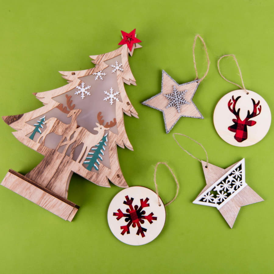 Деревянные новогодние украшения имеют давнюю историю. Это самый первый материал, из которого изготавливали елочные игрушки еще наши предки. Сегодня эти украшения также пользуются огромной популярностью, ведь деревянные   фигурки олицетворяют собой сказку, детство, ожидание чуда. А что может быть лучше природного материала? Игрушки из дерева экологичны, а потому наиболее гармонично смотрятся на новогодней елке.Помимо прочего, в отличие от стеклянных игрушек, они не бьются и абсолютно безопасны для детей. Украшения из дерева не требуют особых условий хранения и великолепно персонализируются.