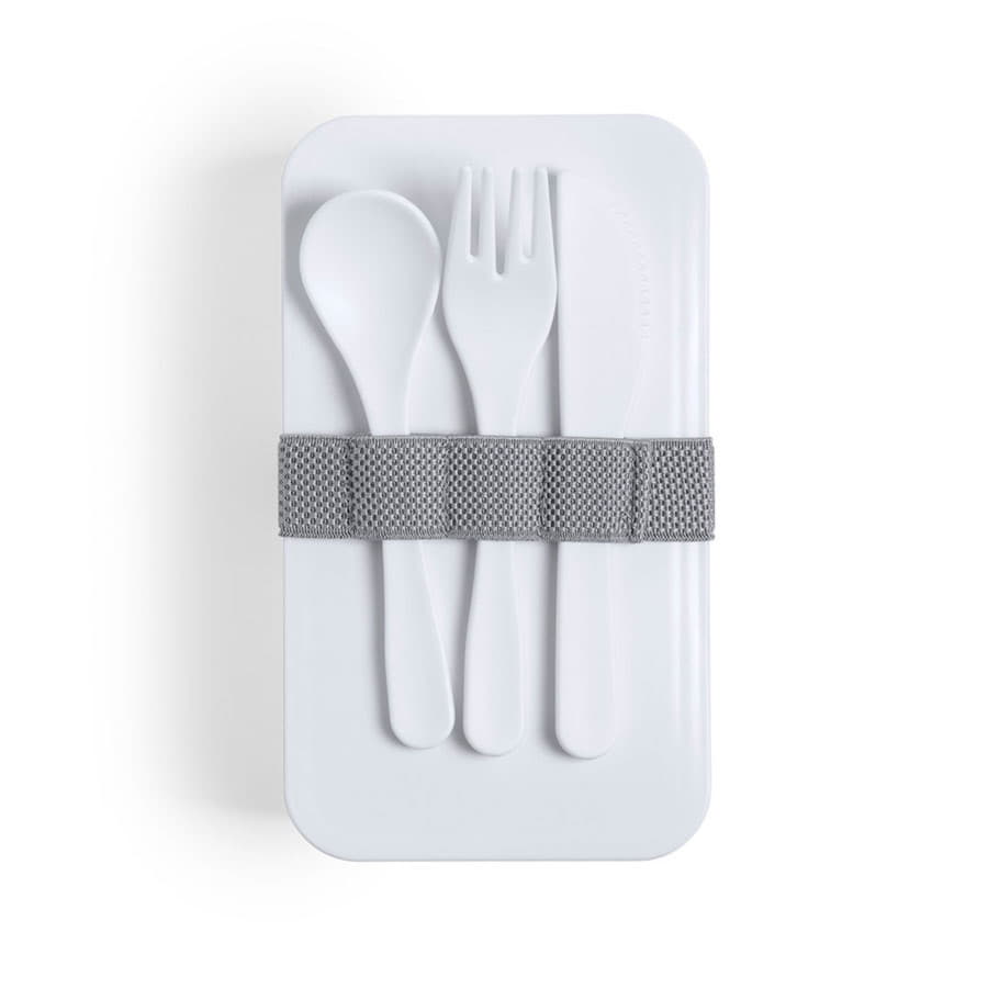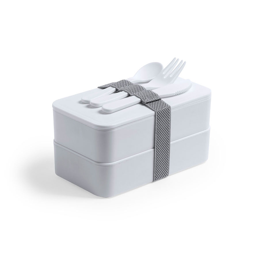 Ланч-бокс с двумя контейнерами, крышками и столовыми приборами: ложка, вилка, нож. Они крепятся на специальной резинке на корпусе изделия. Ланч-бокс изготовлен из  особого антибактериального пластика (BPA free) и упакован в специальный пакет. Антибактериальный пластик  снижает уровень бактерий, присутствующих на поверхностях, благодаря добавлению постоянных статических микробных агентов, с высокой эффективностью предотвращающих бактериальное загрязнение. Изделие соответствует стандарту ISO 22196, который определяет антибактериальную активность в пластичных материалах и непористых поверхностях.     Ланч-бокс  подходит для использования в микроволновой печи, посудомоечной машине и холодильнике.