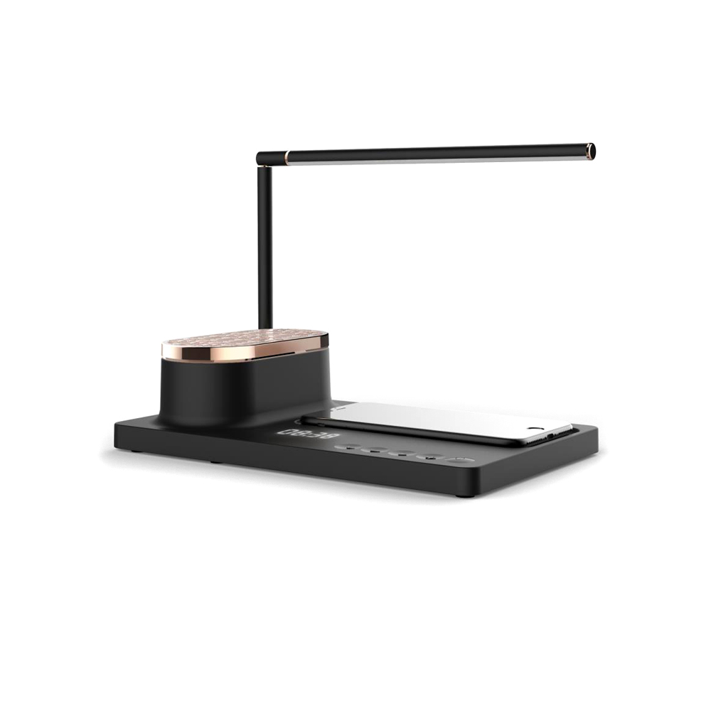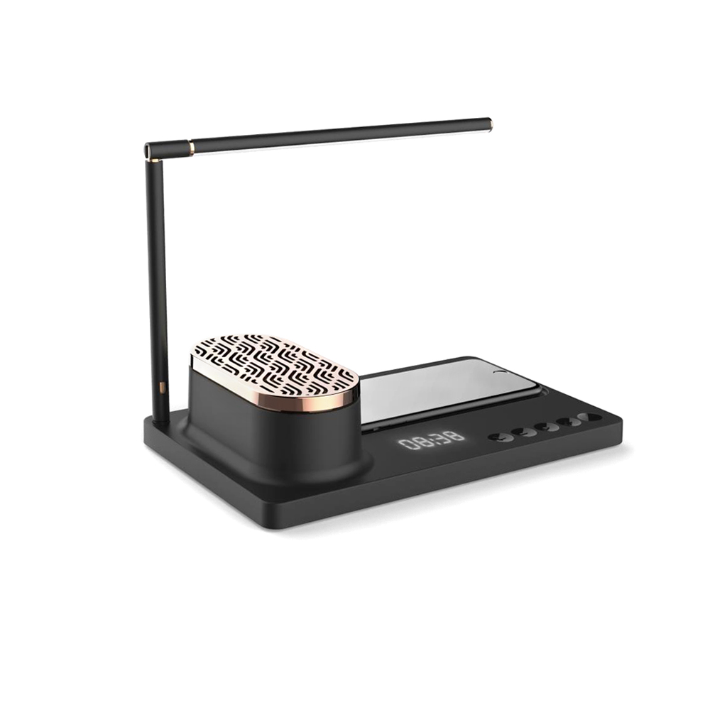 Строгий дизайн и богатый функционал настольной лампы Volando позволит использовать ее как офисный аксессуар, так и как прикроватную лампу для ночного чтения. С функцией беспроводной зарядки Qi мощностью 15W в основании и музыкальной проигрывающей bluetooth колонкой, а также дисплеем для отображения времени. Тип лампы LED, цветовая температура 4000-4500К, мощность лампы: 10W. Питание: 9V/2A. Беспроводная зарядка 9V-3A. Bluetooth JR4. Мощность колонки 5Ω/4W*2. В комплекте сетевой адаптер и инструкция. Для работы беспроводной зарядки необходимо подключать устройство к сети через адаптер.