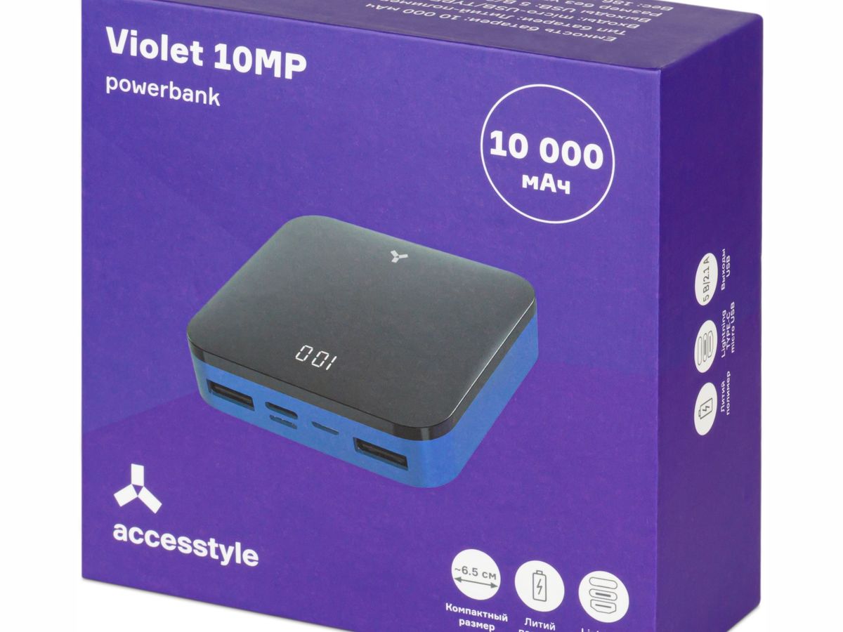 Особенности Accesstyle Violet 10MP размером как два спичечных коробка, LED-экран на корпусе отображает процент зарядки аккумулятора, сочетание алюминия и глянцевого пластика придает этому аккумулятору неповторимость; идеален под нанесение логотипа