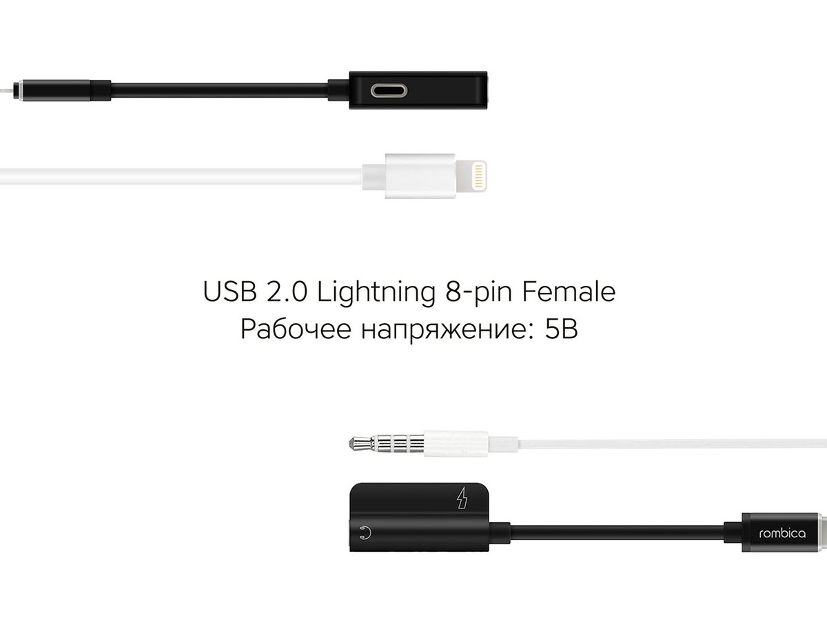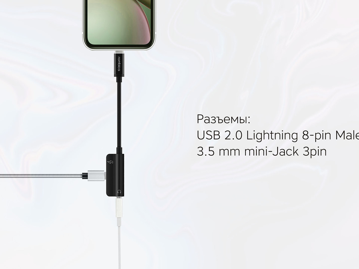 Разъемы USB 2.0 Lightning 8-pin Male - 3.5 mm mini-Jack 3pin (стерео), USB 2.0 Lightning 8-pin Female (только для зарядки)