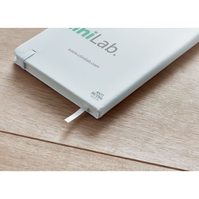 Блокнот формата A5 с мягкой антибактериальной обложкой из полиуретана и 96 линованными страницами (70 гр.) на резинке. ISO 22196. Антибак покрытие обеспечивается серебряным напылением, т.н. нано-сильвер покрытие. FSC®-certified | FSC MIX CREDIT, P7.1, FSC-C213206
