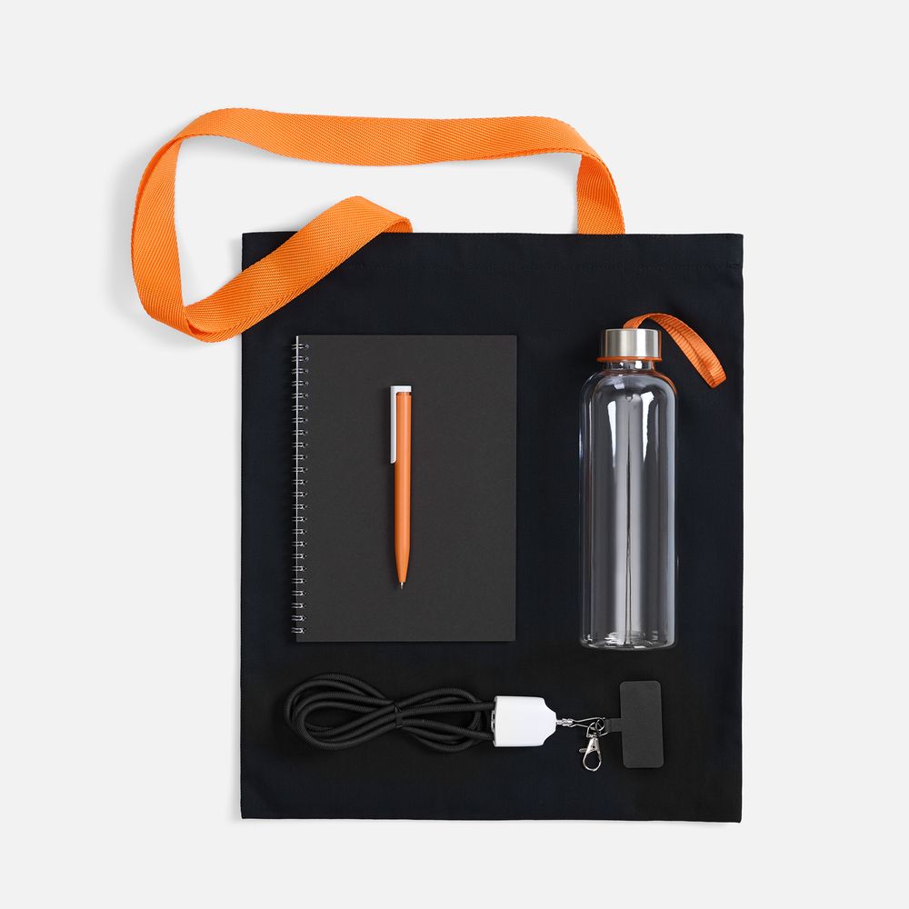 Материал сумка - хлопок, 240 г/м²; ручки - полиэстер; кабель-ланьярд - нейлон, пластик; металл; бутылка - пластик, пищевой; крышка - металл, пластик; блокнот - бумага, картон; ручка - пластик