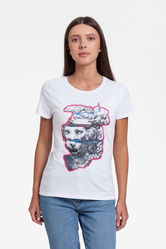 Петербург многослоен: исторически, географически, архитектурно. Здесь гармонично переплелось множество миров и времен, и знаменитые скульптуры львов словно таят в себе тайны далекого прошлого и, как стражники, наблюдают за настоящим.«Смотри вглубь», ведь все вокруг удивительно многомерно.Кроеная футболка приталенного силуэта с круглым воротом.