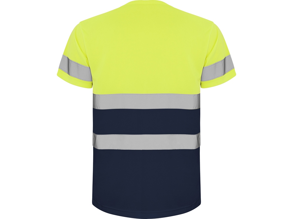 Футболка со светоотражающими элементами с короткими рукавами. Круглая горловина из той же ткани, с усиленными закрытыми швами на внутренней стороне горловины. Две горизонтальные светоотражающие полосы на туловище и одна светоотражающая полоса на рукавах.