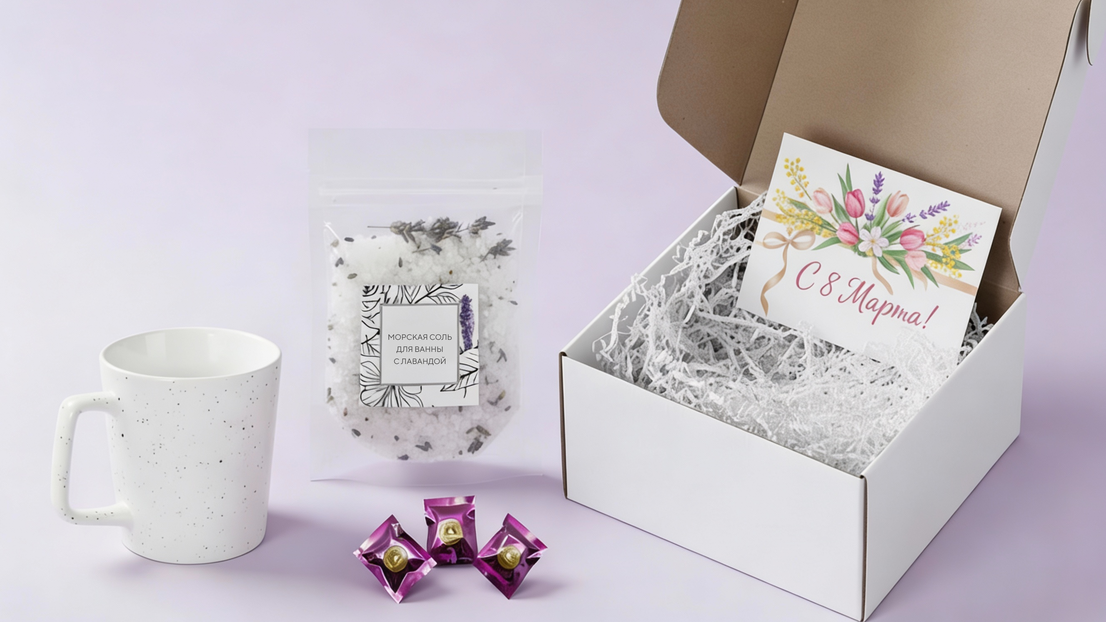 Набор в нежных оттенках с кружкой, солью для ванны и чаем с предсказаниями.