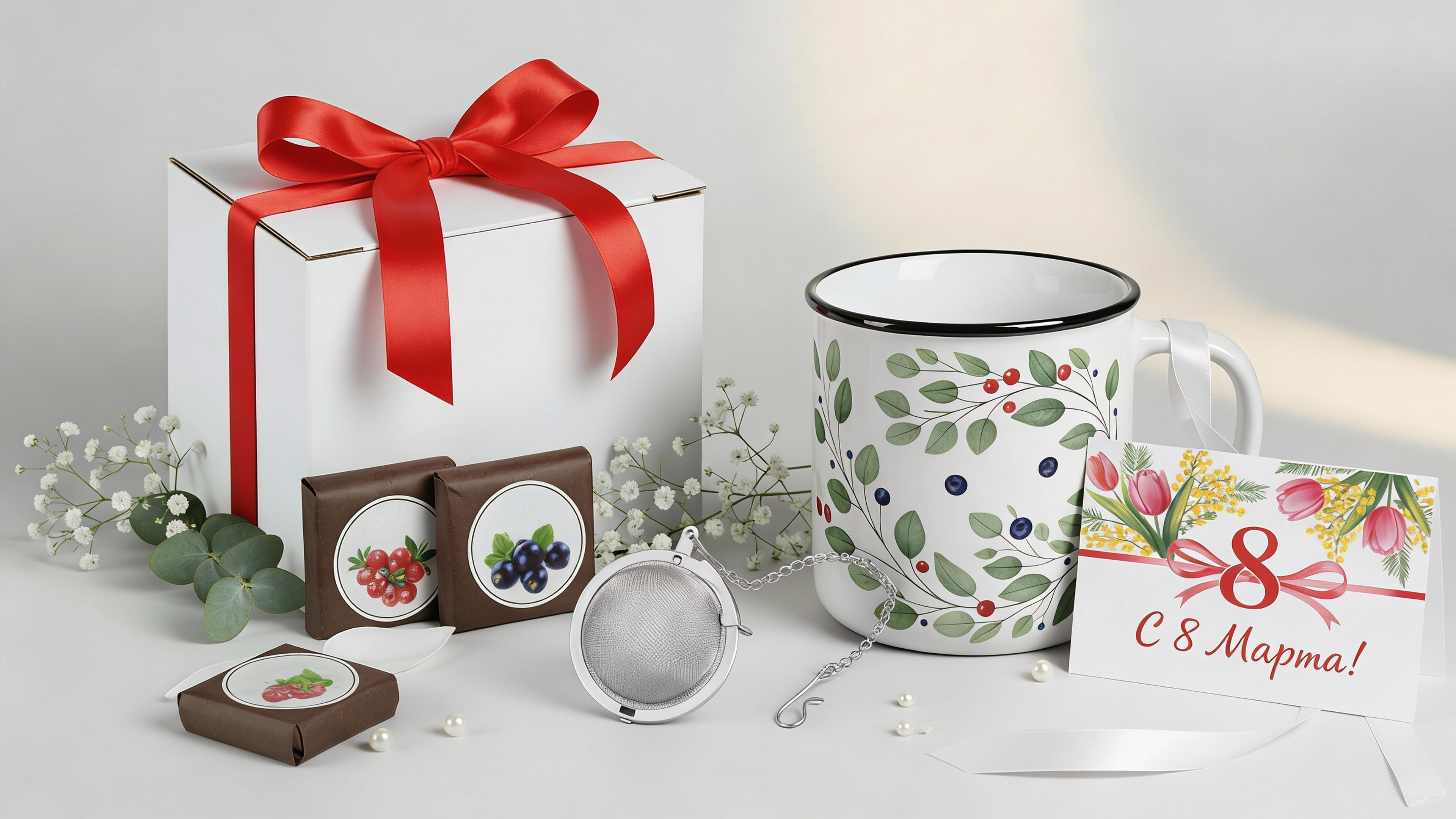 Лаконичный подарочный набор из кружки, чая и ситечка для чая.