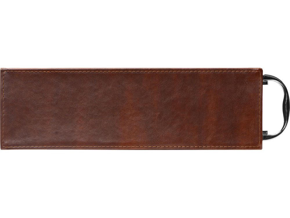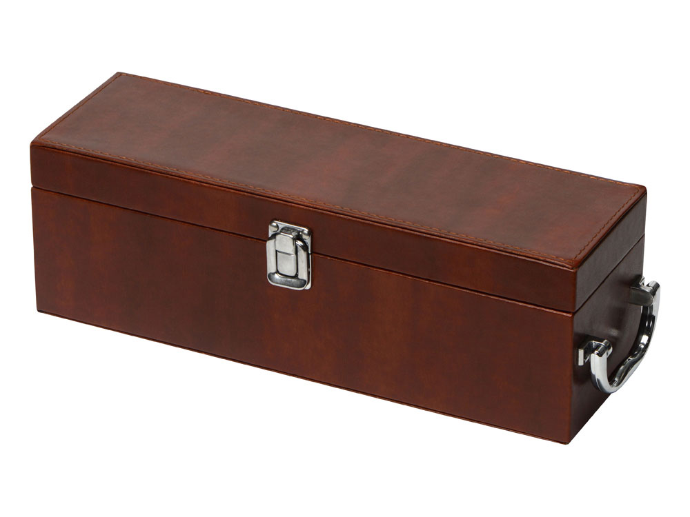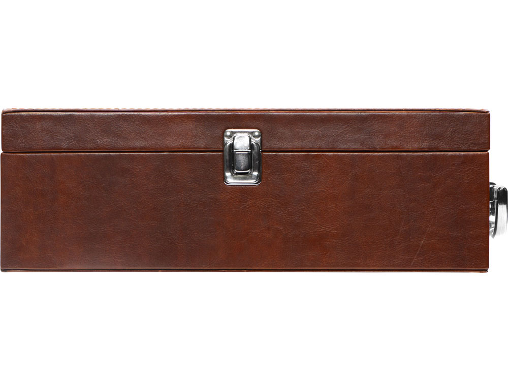 Набор винных аксессуаров состоит из воронки-аэратора, штопора, каплеуловителя и ножа для срезания фольги. Металлические детали выполнены из нержавеющей стали, устойчивой к коррозии, также использованы силиконовая резина и АБС-пластик, абсолютно безопасный для человека. Самое главное — это футляр, в котором находится набор: принадлежности расположились в вырубленных нишах на крышке, а большое основное отделение предназначено для бутылки вина. Футляр декорирован искусственной качественной кожей, точно такой же по цвету и текстуре, как и у других изделий линейки Fabrizio, что позволяет составлять с ним гармоничные наборы. - место под бутылку вина - воронка-аэратор позволяет насытить вино кислородом, чтобы раскрыть вкус и аромат напитка - каплеуловитель защитит вас от винных подтеков - удобный нож для срезания фольги - нержавеющая сталь обеспечивает изделиям долгую жизнь - удобная ручка футляра для переноски - легко собирать наборы с другими изделиями серии Fabrizio благодаря общему стилю