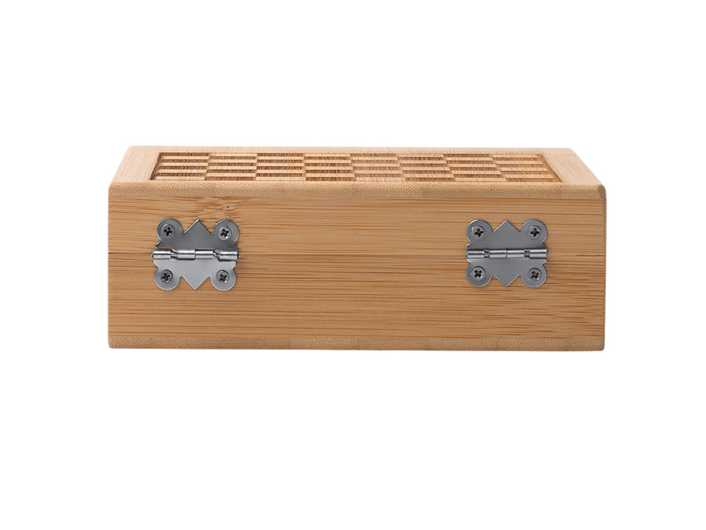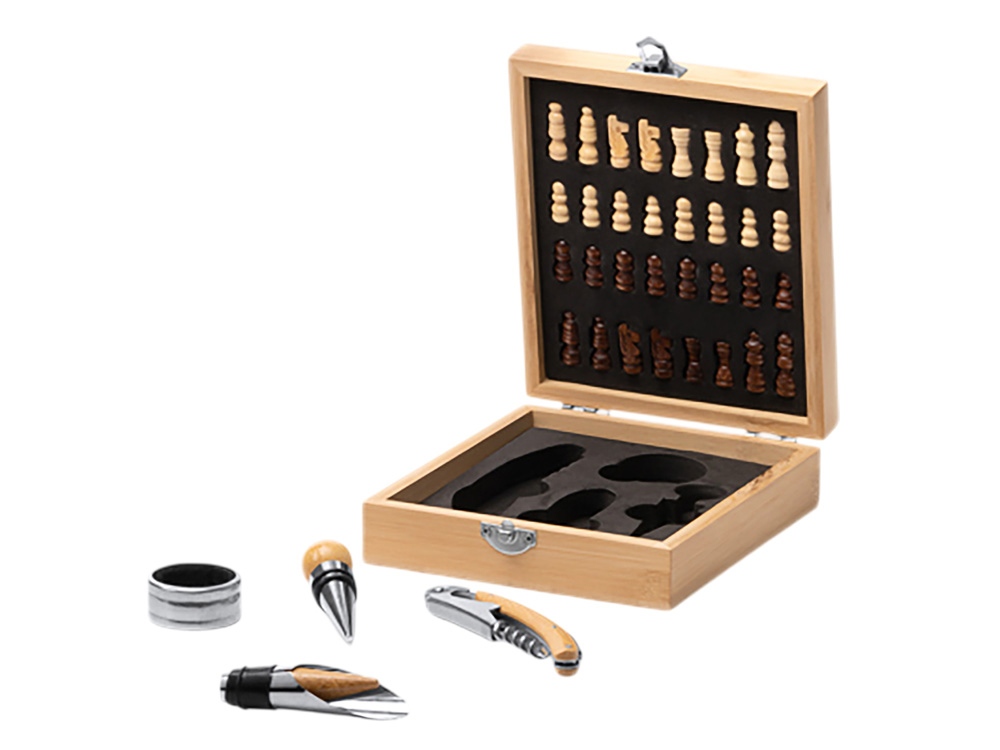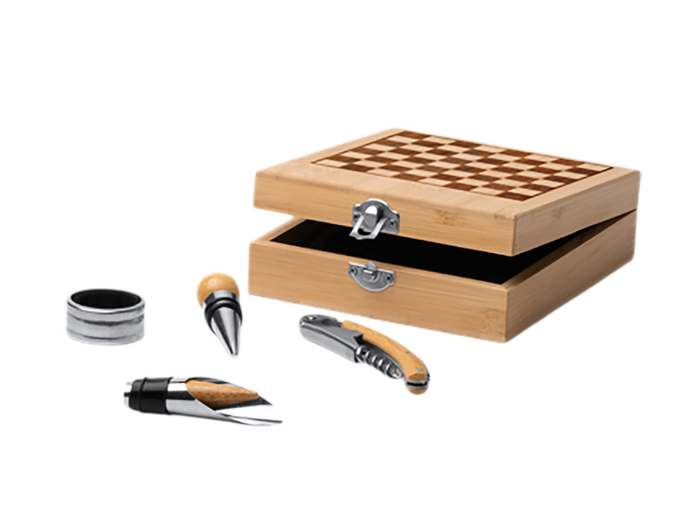Винный набор с аксессуарами из нержавеющей стали и бамбука. Представлен в бамбуковом футляре с шахматным рисунком. Мягкая внутренняя отделка. В комплекте игровые фишки и 4 аксессуара: штопор, дозатор, крышка и кольцо для сбора капель. Поставляется в экологичной дизайнерской коробке.