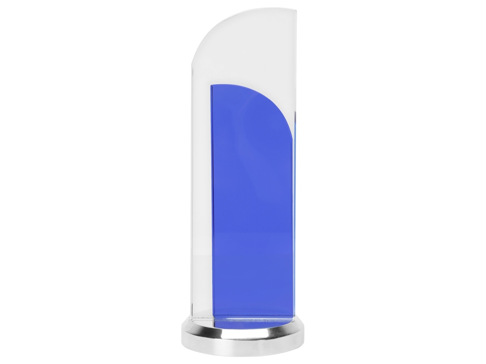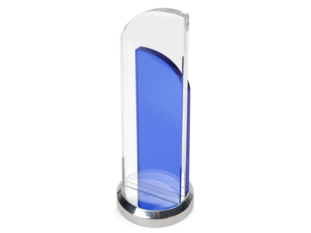 Утонченный вариант награды из стекла двух цветов. Конструкция воссоздает образ поднятого паруса. Нанесение можно сделать на любом из стеклянных элементов.