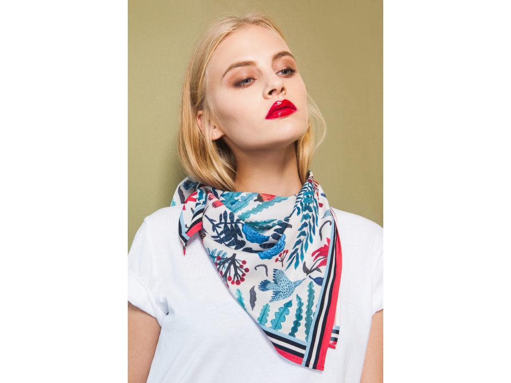 Платок из искусственного шелка саржевого плетения (твил) размером 70*70 см., с авторским принтом Голубые розы. Авторский принт написан художницей вручную специально для российского бренда Varvara. Художница размышляла на тему русской природы, культуры и искусства: в основе принта лежат листья папоротника, соцветия клюквы, бутоны розы и загадочные птицы. Композиция рисунка напоминает иллюстрацию к русским сказкам. Платок упакован в подарочный тубус. Бережный уход. Ручная стирка при температуре не выше 30 градусов.