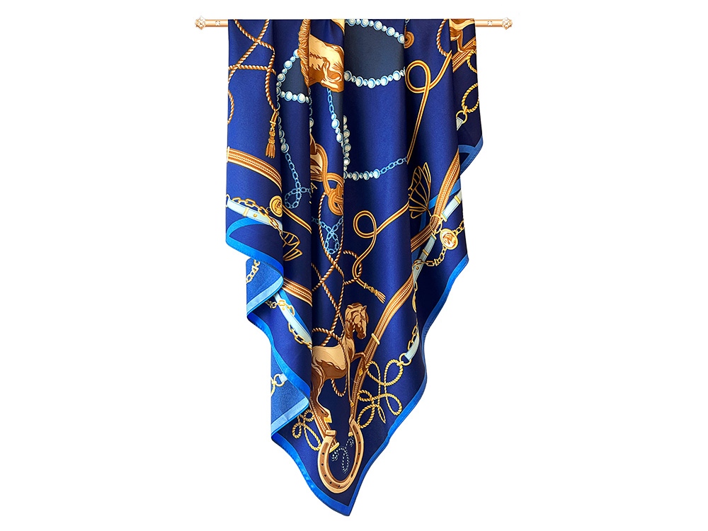 Платок Конный клуб вдохновлен духом русского аристократизма, тесно связанного с традициями верховой езды. Образ лошади, занимающий особое место в изобразительном наследии России, — от древнерусской миниатюры до современных шедевров живописи — ассоциируется с благородством, честью и внутренней силой. Платок воплощает эти возвышенные качества, отраженные в природной эстетике конного экстерьера. В центре композиции размещены стилизованные портреты лошади элегантной рыжей масти. Ощущение воздушной среды и размах открытых просторов переданы сочетанием светло-бежевых, золотых, голубых оттенков фона. Рисунок изящной амуниции образует ажурный декор с акцентными элементами, заключая изображение в эффектную рамку. Платок Конный клуб создан брендом Русские в моде совместно с маркой VUA-LYA, производителем одежды и аксессуаров. Платок станет изысканным атрибутом стиля или незабываемым прекрасным подарком! Над дизайном платка работали: Нина Ручкина, Ольга Данилова.