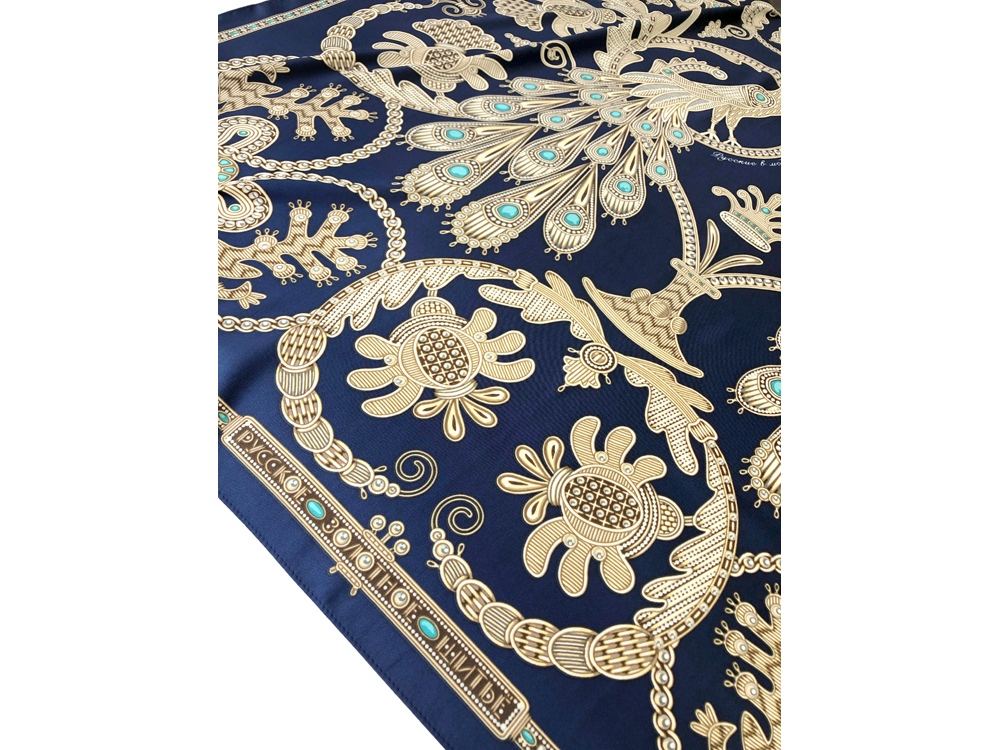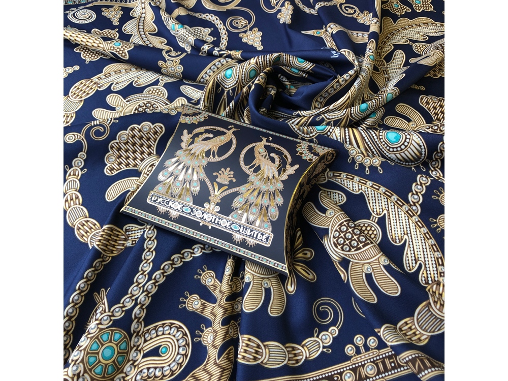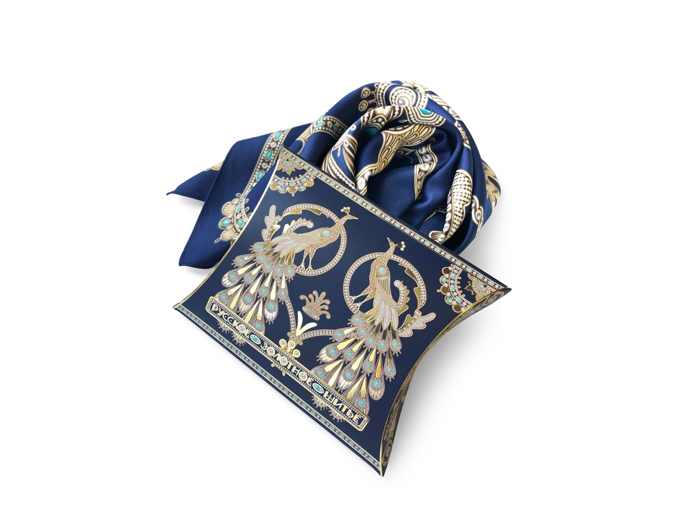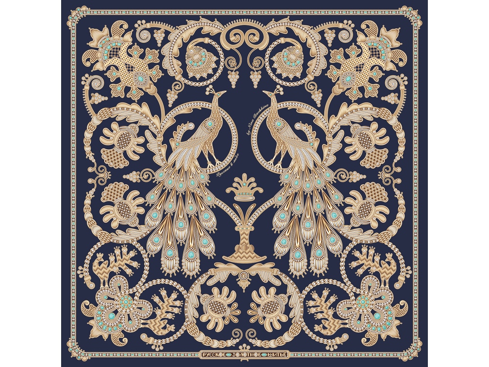 Платок Русское золотное шитьё посвящён драгоценному старинному русскому рукоделию. Дошедшие до нас памятники шитья, выполненные русскими мастерицами, являются произведениями высокой культуры. В изделиях сочетаются талант художника и тонкий вкус, духовное богатство, исполнительское мастерство вышивальщиц. В центре композиции излюбленный сюжет традиционного русского орнамента - царственные павлины. Они горделиво восседают в обрамлении из фантастических цветов и виноградных лоз. Павлин в русской культуре — это жар-птица, которая несет в себе солнечную энергию развития, поэтому это птица семейного счастья. Они всегда рассаживаются на свадебных рушниках. Павлин за красоту своих перьев стал символом расцвета, молодости. Про стройную, красиво одетую девушку говорят: Будто пава плывет. Мы старались воссоздать в рисунке сложную фактуру древнего промысла, придав золотошвейному искусству новую форму. Желаем всем обладательницам платка Русское золотное шитьё наполниться энергией и тёплом посланий предков. А изысканная цветовая гамма платка сделает этот аксессуар незаменимым в гардеробе любой леди, неравнодушной к современной моде. Дизайн: Нина Ручкина, Наталия Александрова.