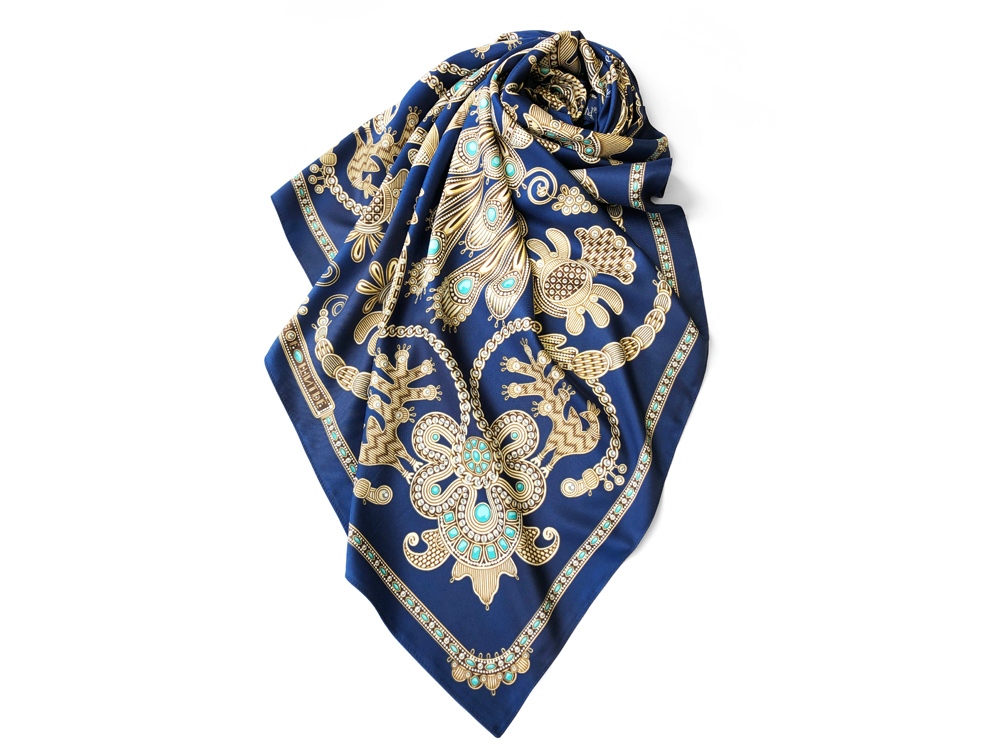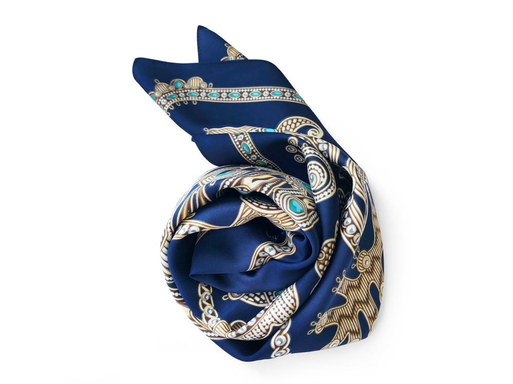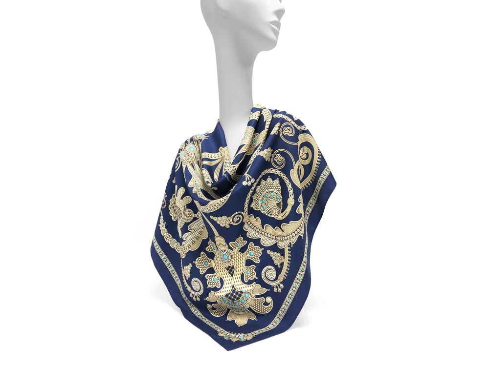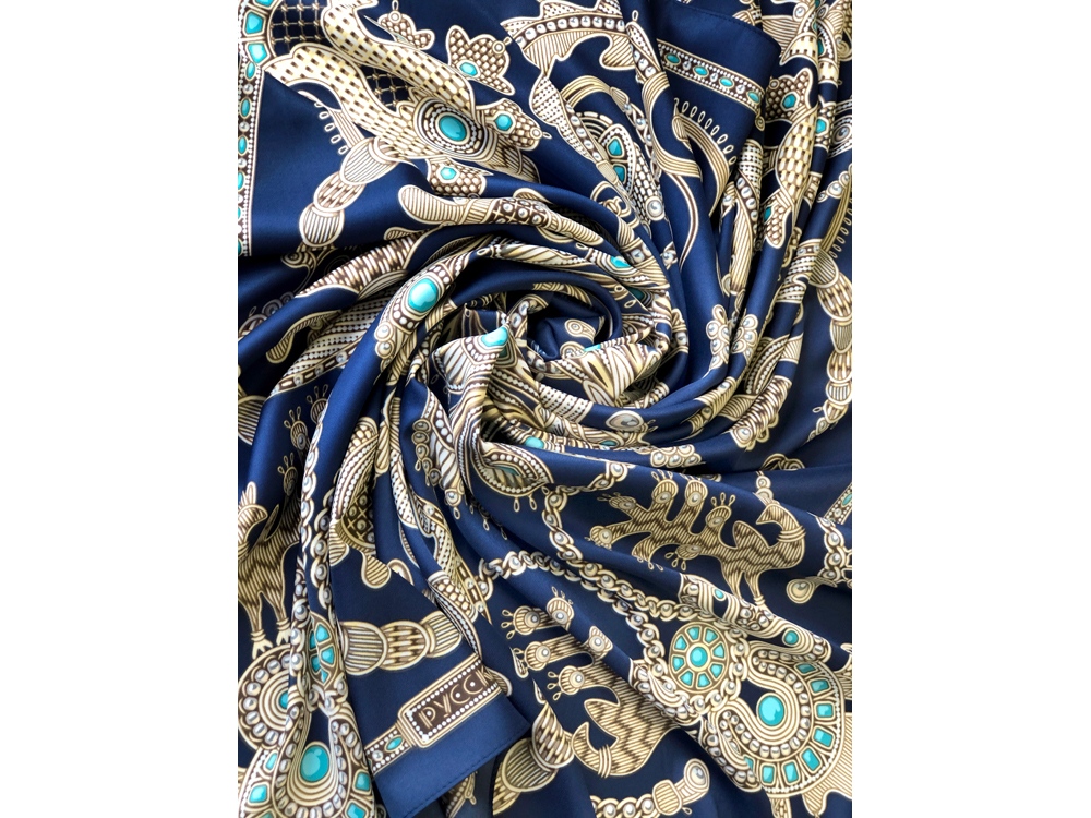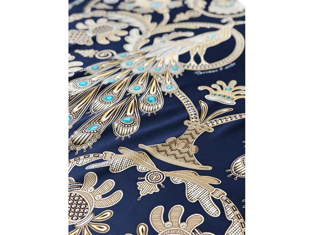 Платок Русское золотное шитьё посвящён драгоценному старинному русскому рукоделию. Дошедшие до нас памятники шитья, выполненные русскими мастерицами, являются произведениями высокой культуры. В изделиях сочетаются талант художника и тонкий вкус, духовное богатство, исполнительское мастерство вышивальщиц. В центре композиции излюбленный сюжет традиционного русского орнамента - царственные павлины. Они горделиво восседают в обрамлении из фантастических цветов и виноградных лоз. Павлин в русской культуре — это жар-птица, которая несет в себе солнечную энергию развития, поэтому это птица семейного счастья. Они всегда рассаживаются на свадебных рушниках. Павлин за красоту своих перьев стал символом расцвета, молодости. Про стройную, красиво одетую девушку говорят: Будто пава плывет. Мы старались воссоздать в рисунке сложную фактуру древнего промысла, придав золотошвейному искусству новую форму. Желаем всем обладательницам платка Русское золотное шитьё наполниться энергией и тёплом посланий предков. А изысканная цветовая гамма платка сделает этот аксессуар незаменимым в гардеробе любой леди, неравнодушной к современной моде. Дизайн: Нина Ручкина, Наталия Александрова.