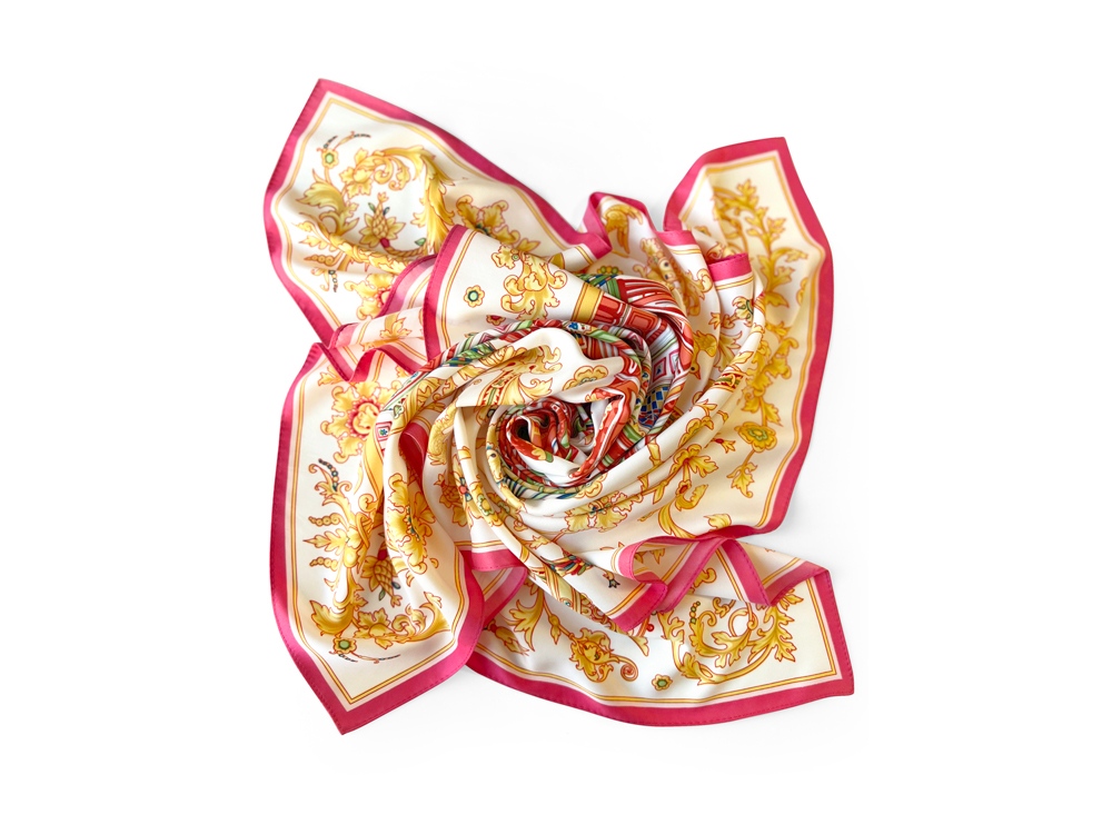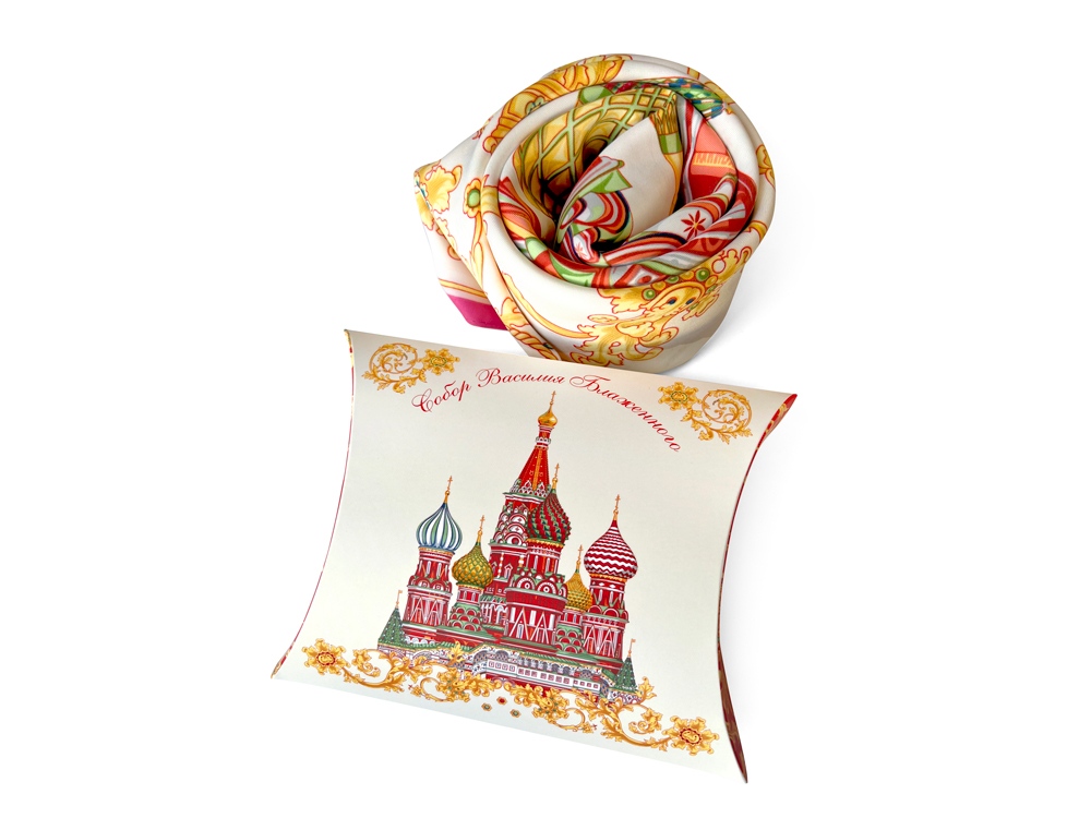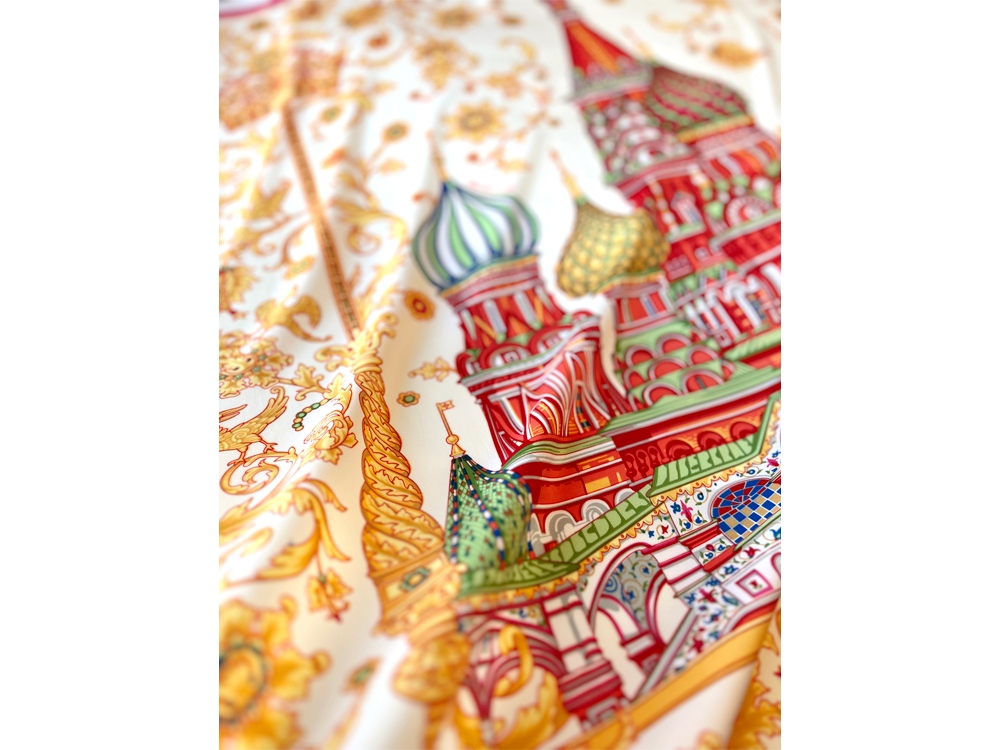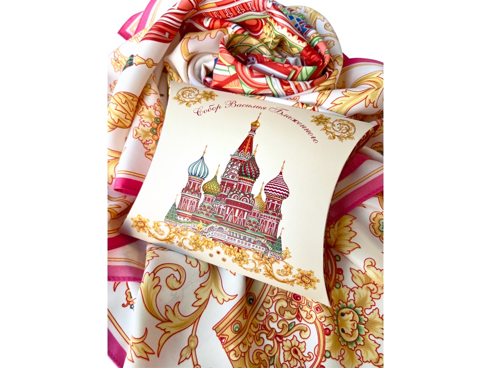Скопище маленьких, разной высоты, башенок, составляющих вместе куст, букет цветов… или, еще лучше разноцветный кристалл, ярко сверкающий своими гладкими гранями в солнечных лучах…. Это слова французского путешественника Кюстина Астольфа, который посвятил книгу истории России 1839 года и очень точно описал знаменитый Собор Василия Блаженного. Уникальный памятник архитектуры был возведен в честь победы Руси над Казанским ханством по приказу Ивана Грозного. Собор объединяет сразу 11 церквей с пестрыми куполами разной высоты, образующими четкую форму восьмиконечной Вифлеемской звезды — символа Богородицы. Сказочный вид собора отражен на золотом фоне новинки от бренда Русские в моде by Nina Ruchkina. Настоящее восьмое чудо Света обрамлено царскими коронами и райскими птицами, свидетельствующими об уникальности и роскоши этой исторической достопримечательности, отстроенной 1 октября 1552 года на праздник Покрова Богородицы. Мы искренне надеемся, что новый дизайнерский платок сделает ваш образ еще более благородным, ярким и впечатляющим. Пусть он подчеркивает вашу женственность, оберегает с Божьей помощью и привносит чудеса в вашу жизнь! Над дизайном работали: Нина Ручкина, Наталия Александрова.