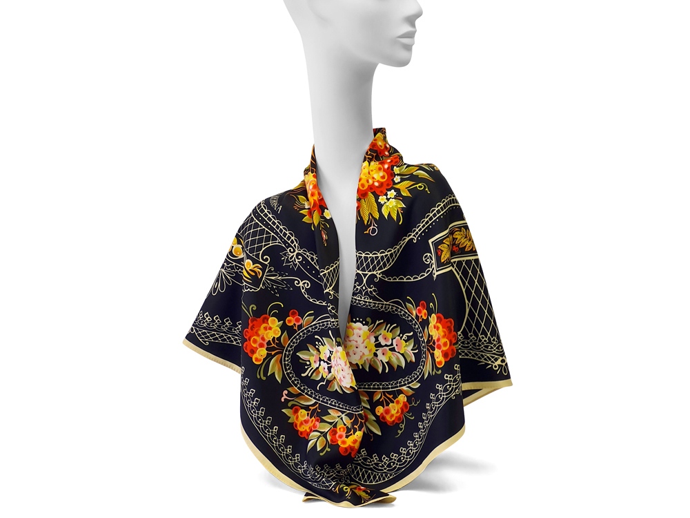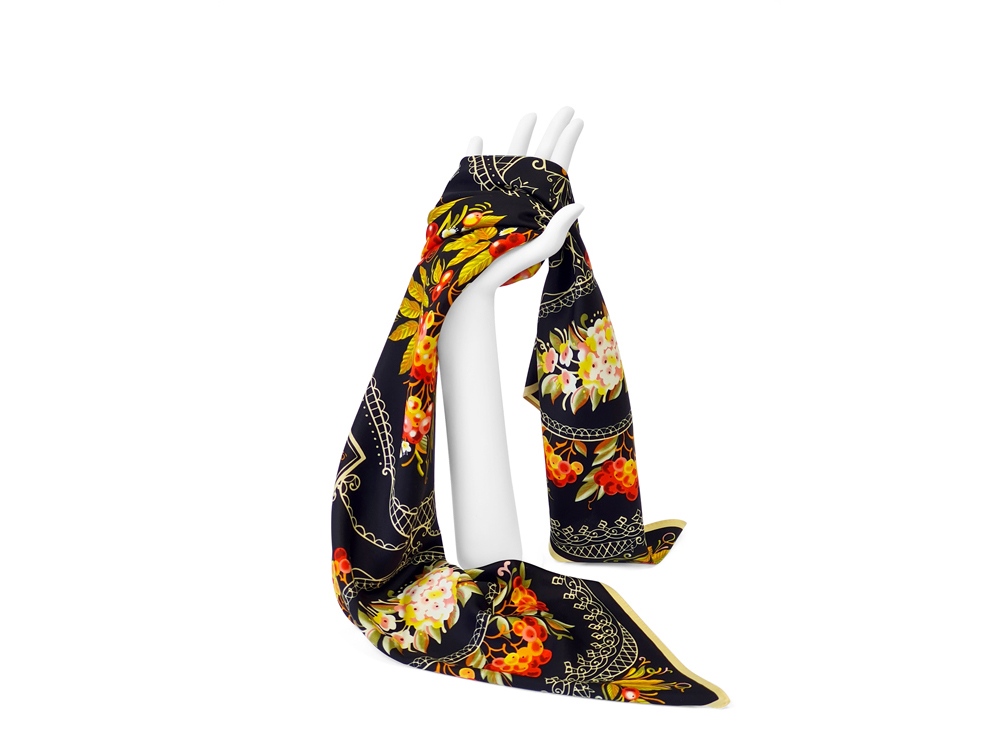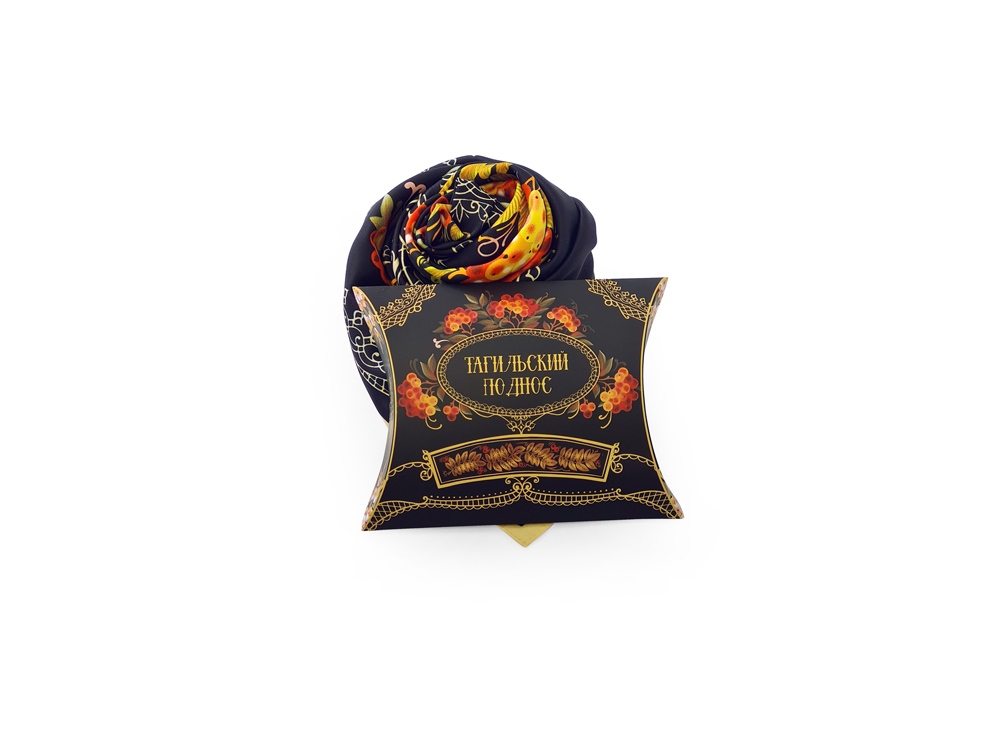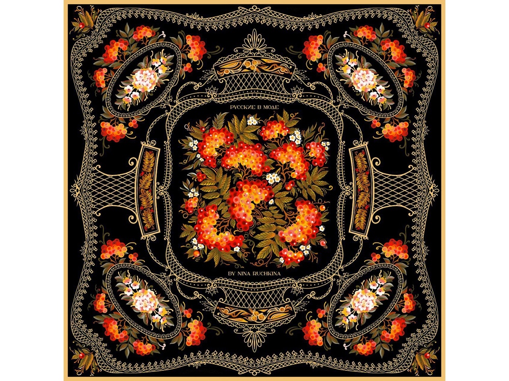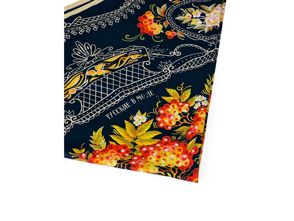 Платок Тагильский поднос станет ярким акцентом в вашем гардеробе. Насыщенная терракотово-чёрная цветовая гамма плодов всегда актуальна, а нежные оттенки цветов рябины внесут настроение романтичности и легкости.