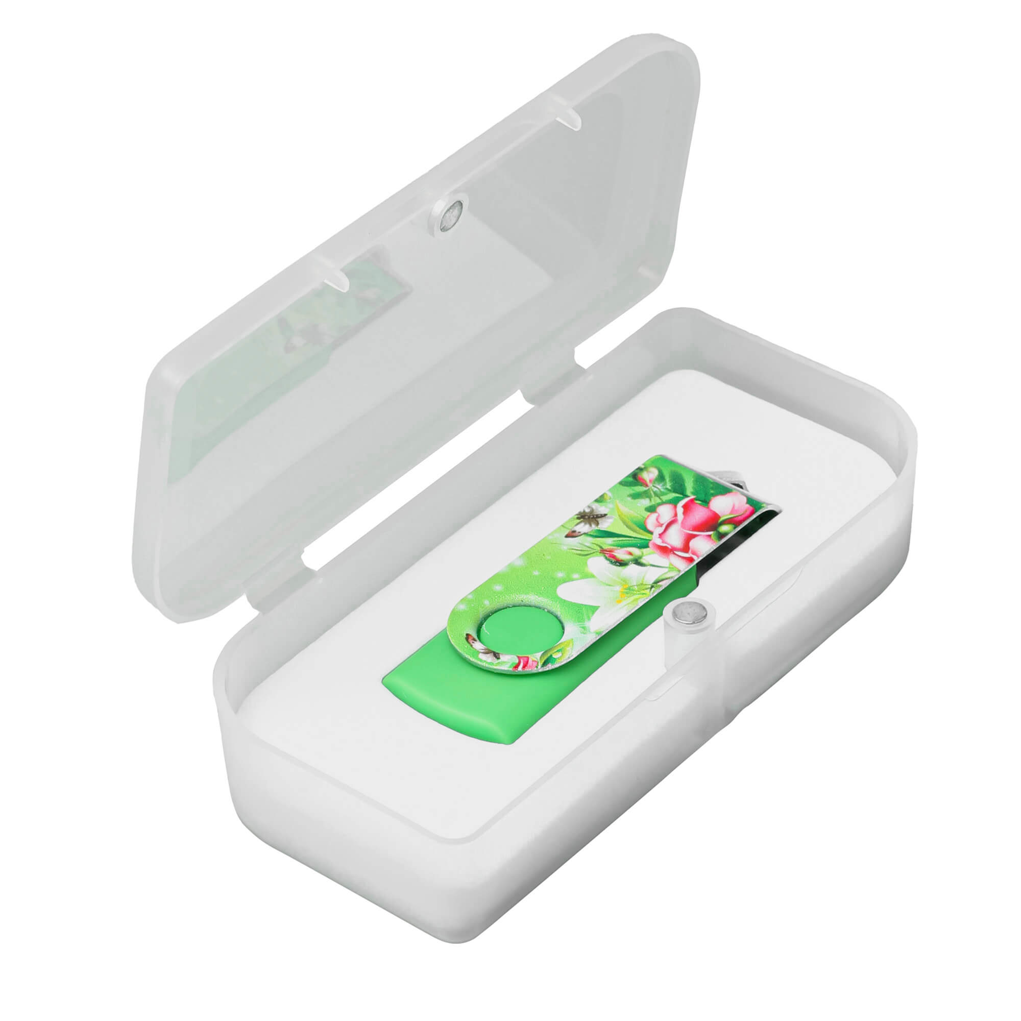 Пластиковая упаковка для флешки на магните. Поставляется с ложементом без прорезей. На крышке возможно нанести УФ печать