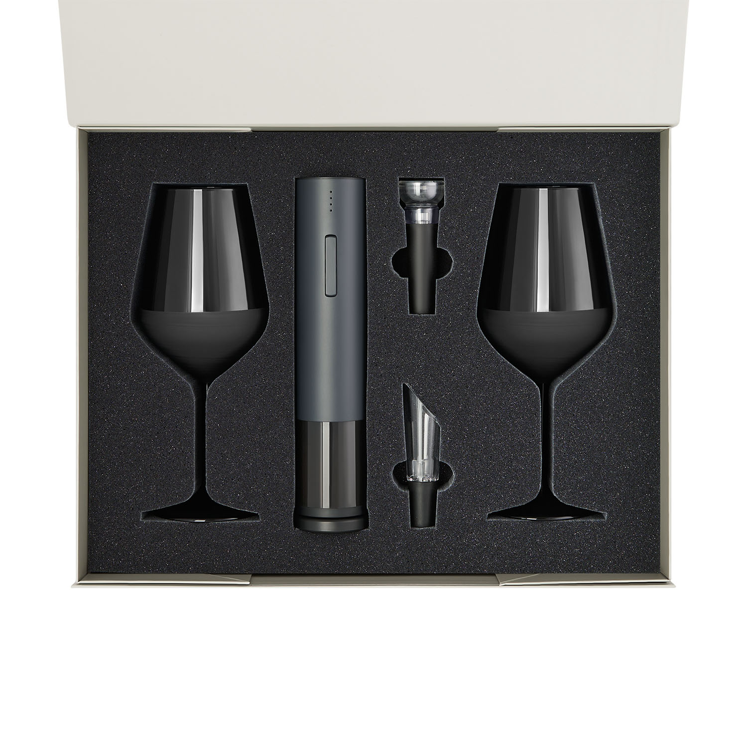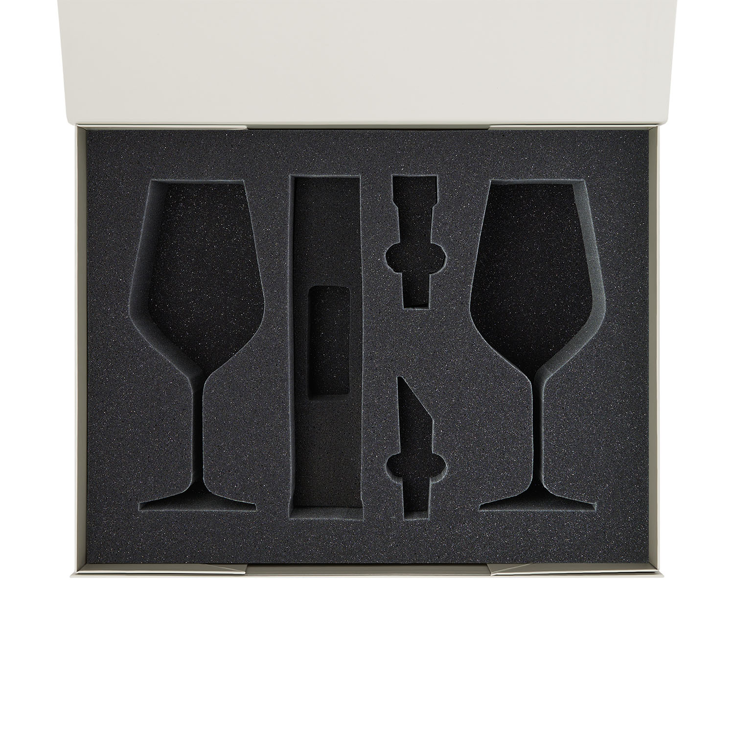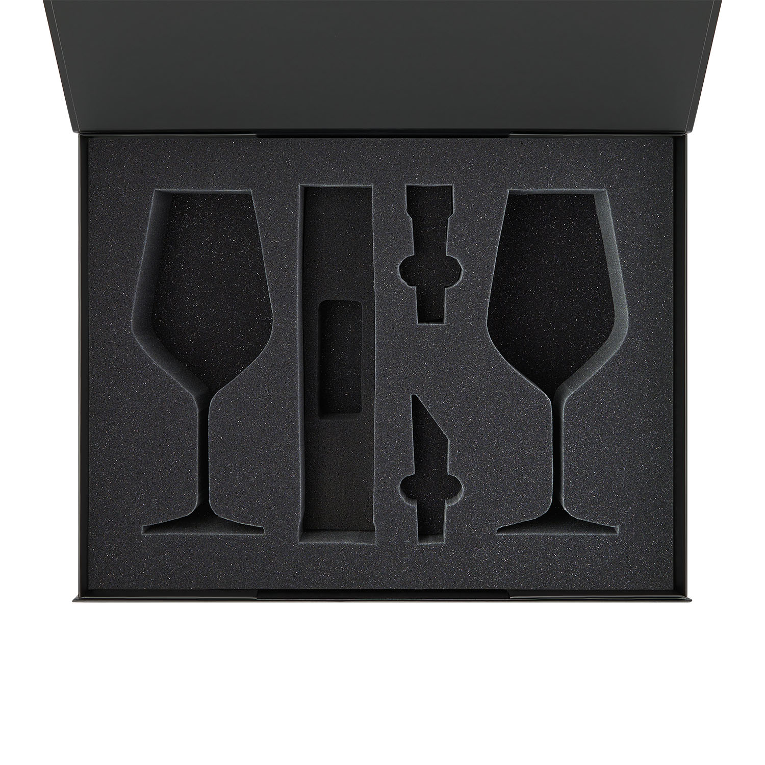 Идеальное решение для надежной и стильной упаковки двух бокалов для вина и набора для вина с электрическим штопором.