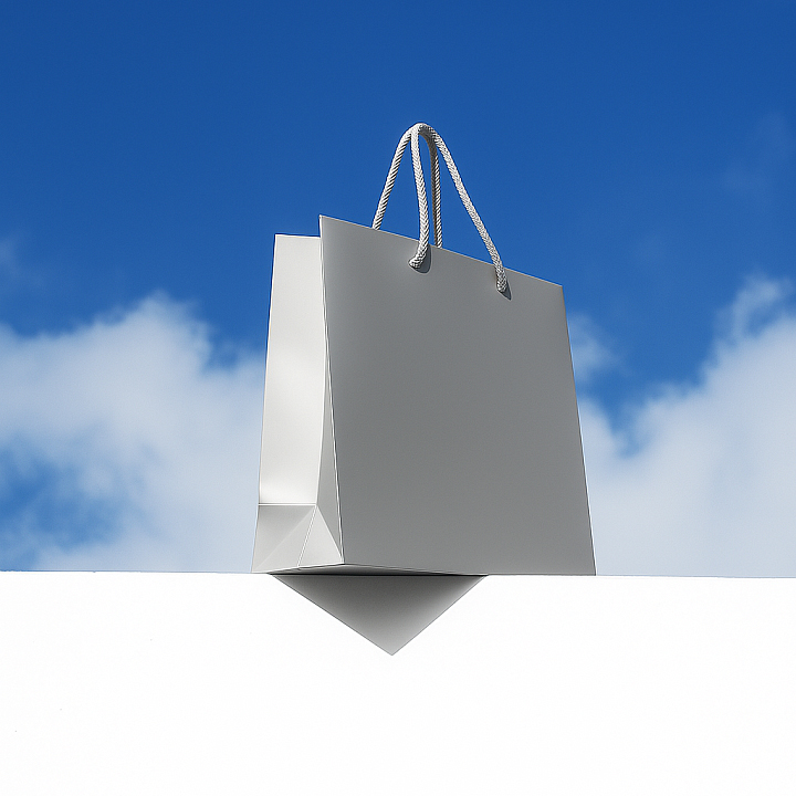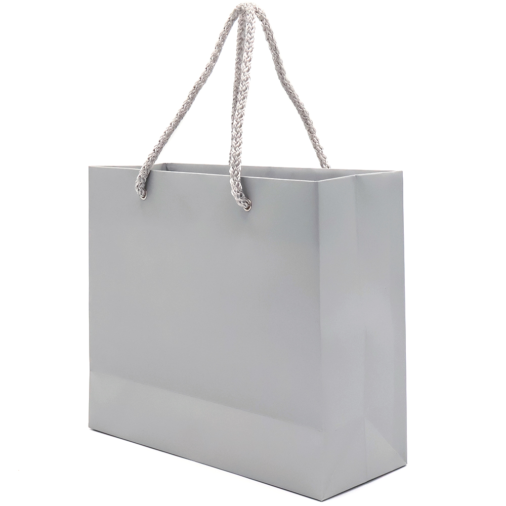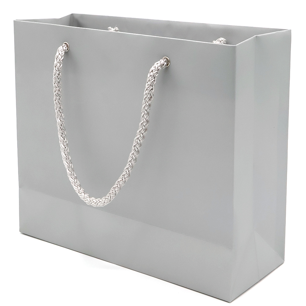 Бумажный цветной пакет плотностью 170 г/м². Покрытие софт-тач. Шнур 6 мм серого цвета. Люверс - серебристый.