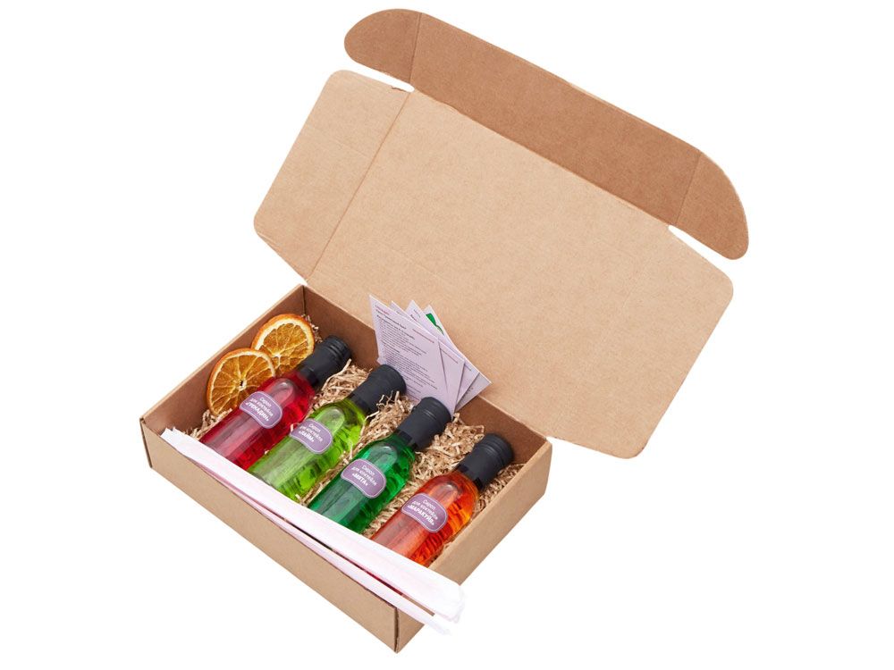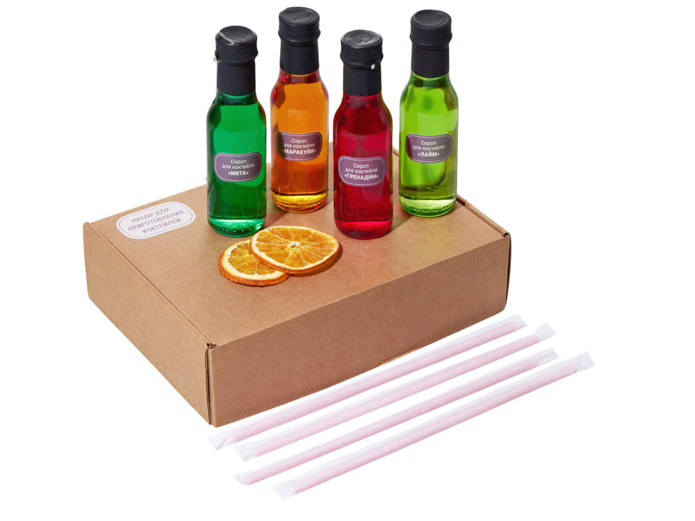 Подарочный набор, который превращает любой вечер в маленький праздник. В стильной упаковке собраны: - 4 бутылочки сиропов по 100 мл с яркими вкусами: Лайм, Маракуйя, Мята, Гренадин – классика коктейльного бармена. - 6 трубочек для коктейлей. - Подобранные специи для изящного декора напитков. - 4 карточки с рецептами – готовые идеи для быстрого приготовления коктейлей. Такой набор – универсальный и статусный подарок для партнёров, клиентов или сотрудников. Он подчеркнёт внимание к деталям, создаст атмосферу гостеприимства и станет стильным акцентом любого корпоративного мероприятия. В комплект входит: - бутылки с сиропом для коктейлей 100 мл: Лайм, Маракуйя, Мята, Гренадин - трубочки для коктейля 6 шт. - специи для декора коктейля - карточки с рецептами 4 шт.
