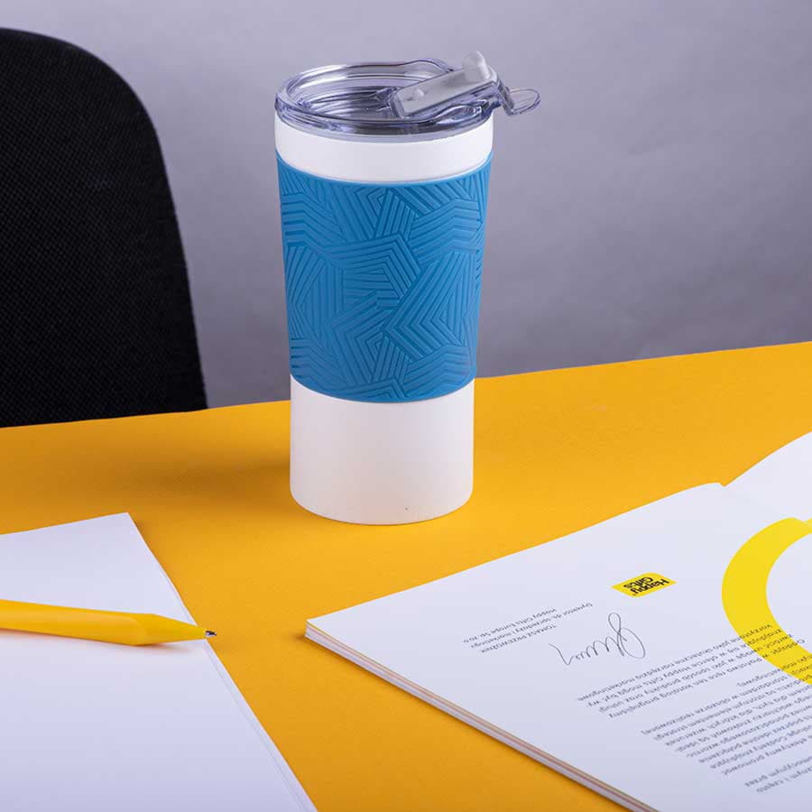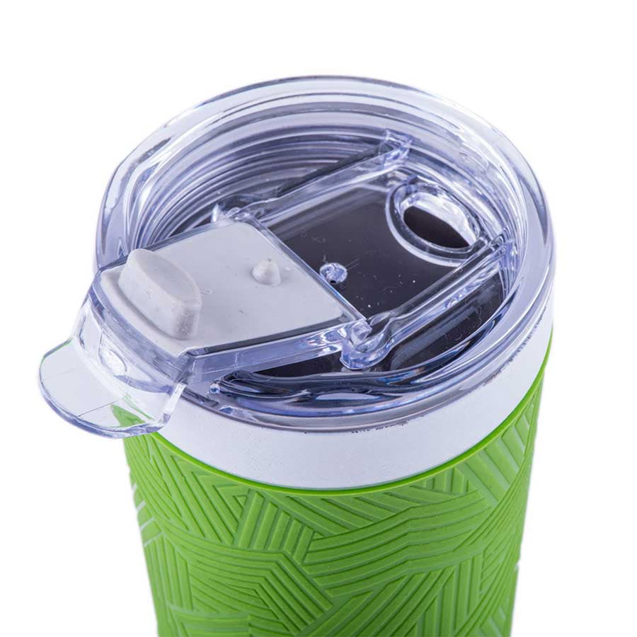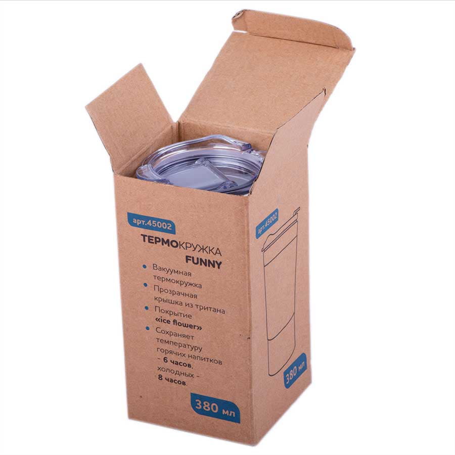 Вакуумная термокружка с покрытием "ice flower" и силиконовой манжетой.Закручивающаяся крышка выполнена из высококачественного прозрачного пластика - тритан.Сохраняет температуру горячих напитков  до  6 часов, холодных напитков - до  8 часов.Подходит для автомобильных подстаканников. Цвет близкий к pantone 7489C.