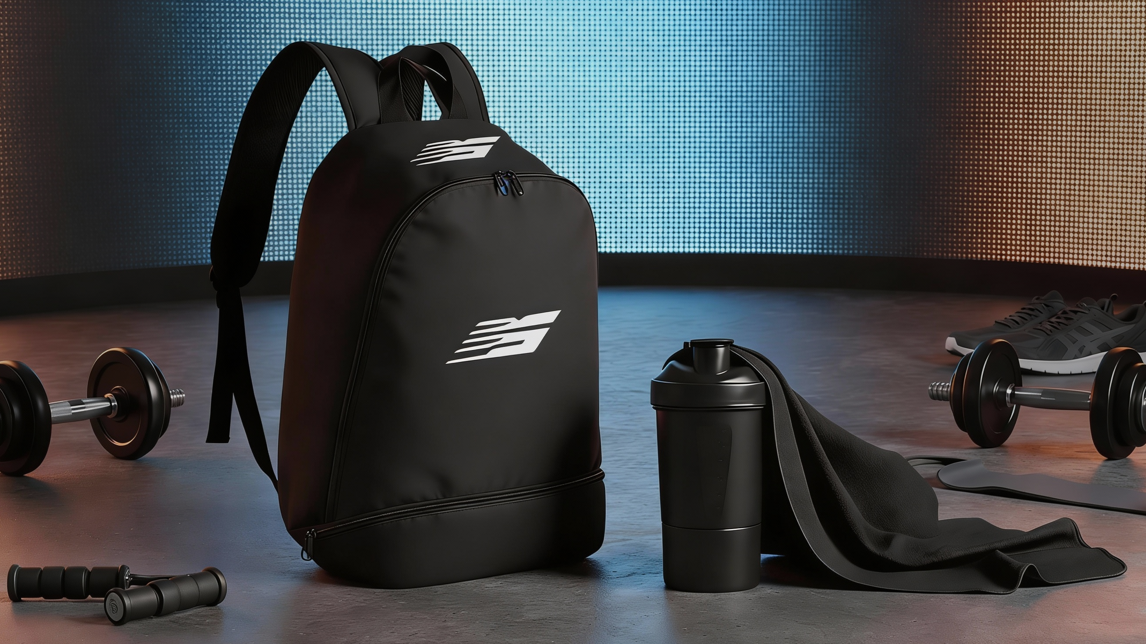 Набор из рюкзака с отсеком для обуви, спортивного шейкера и охлаждающего полотенца.