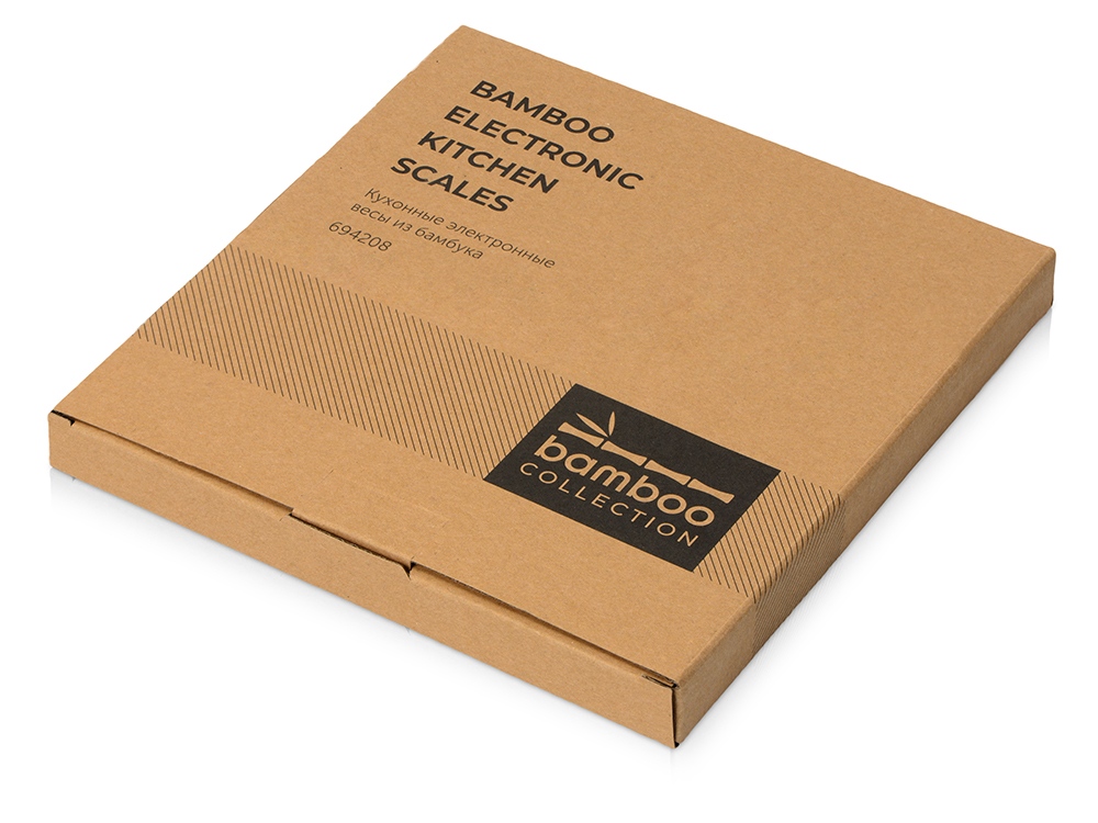 Кухонные весы – незаменимый аксессуар, который пригодится тем, кому часто приходится соблюдать точные пропорции. Платформа изготовлена из натурального бамбука. Этот материал отлично отталкивает влагу и предотвращает распространение бактерий. Лаконичный внешний вид позволяет весам вписываться в любой интерьер. • Датчики высокой точности гарантируют корректность взвешивания; • минимальная нагрузка – 1 г, а максимальная – 5 кг; • точность измерения – 1 г; • функция сброса веса тары позволяет один за другим взвешивать ингредиенты без учета массы посуды; • автоматическое отключение; • присутствуют индикаторы низкого заряда батареи и перегрузки; • можно свободно переключаться между граммами, фунтами, унциями, миллилитрами и жидкими унциями; • работа от двух батареек 1.5V AAA. На кухонные весы Scale можно нанести логотип компании, и тогда они будут не только радовать владельца своей функциональностью, но и повышать узнаваемость фирмы.