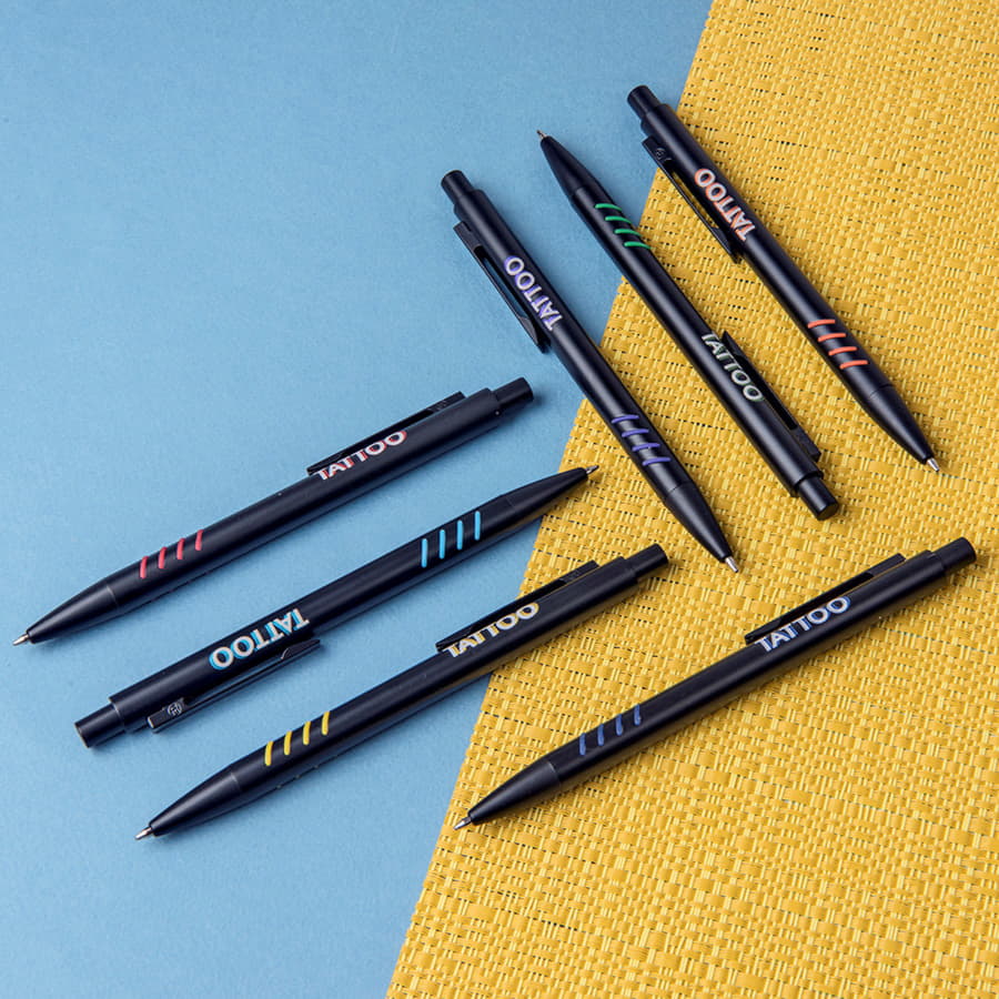 Цветные грип-вставки, контрастирующие с полностью черным корпусом - не единственная особенность TATTOO.  На этой ручке возможна двухцветная 3D-гравировка. Зеркальная подложка в цвет прорезиненных вставок в сочетании с белым матовым покрытием позволяют получить эффект объема при  нанесении логотипа или рекламного сообщения.   Pantone, близкий к 298C.