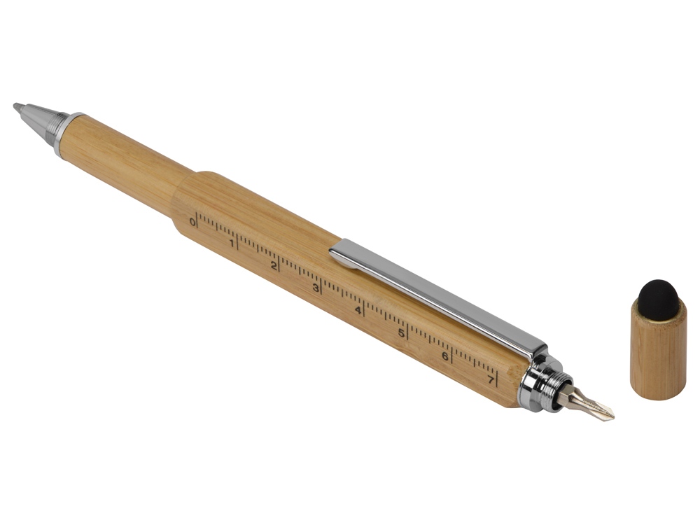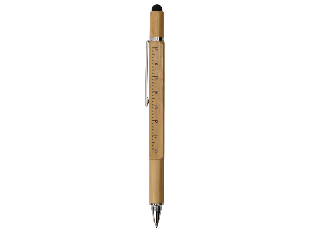 Четырехгранная шариковая ручка с поворотным механизмом в бамбуковом корпусе сочетает несколько полезных функций: • Стилус для работы с устройствами с сенсорными экранами. • Линейка на 7 см. • Под стилусом располагаются крестовая и плоская отвертки (2 в 1). • Стальной клип надежно удерживает ручку в кармане. • В корпус встроен уровень для определения углового отклонения от горизонтальной или вертикальной поверхности. • Колпачок можно накрутить сверху или снизу ручки. • Возможность нанесения логотипа на две грани ручки.