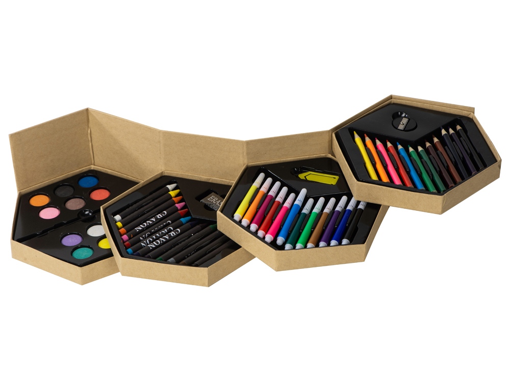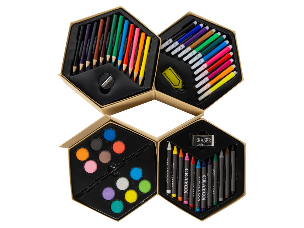 Набор из 52 предметов для рисования. 12 маркеров, 12 цветных карандашей, 12 восковых карандашей, 12 акварельных красок, кисточка, точилка, резинка и большая скрепка.