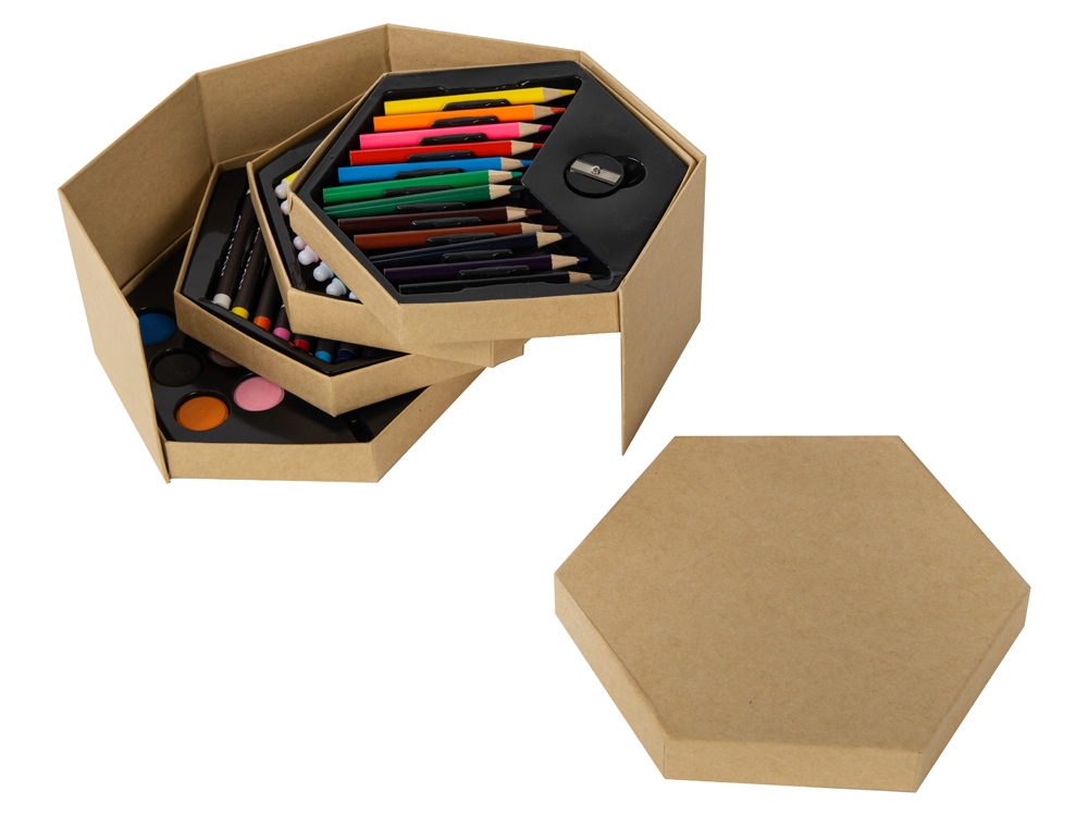 Комплектность маркер - 12шт, цветные карандаши - 12шт, восковые карандаши - 12шт, акварельные краски - 12шт, кисточка, точилка, ластик, скрепка