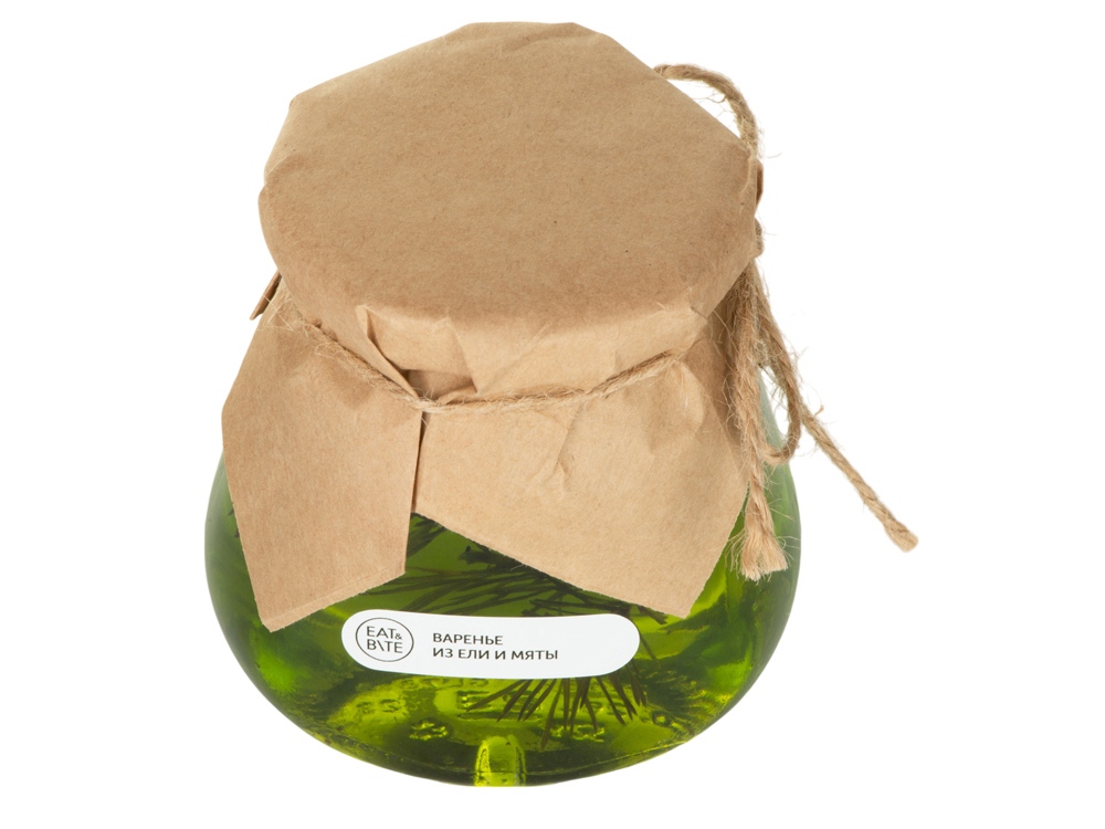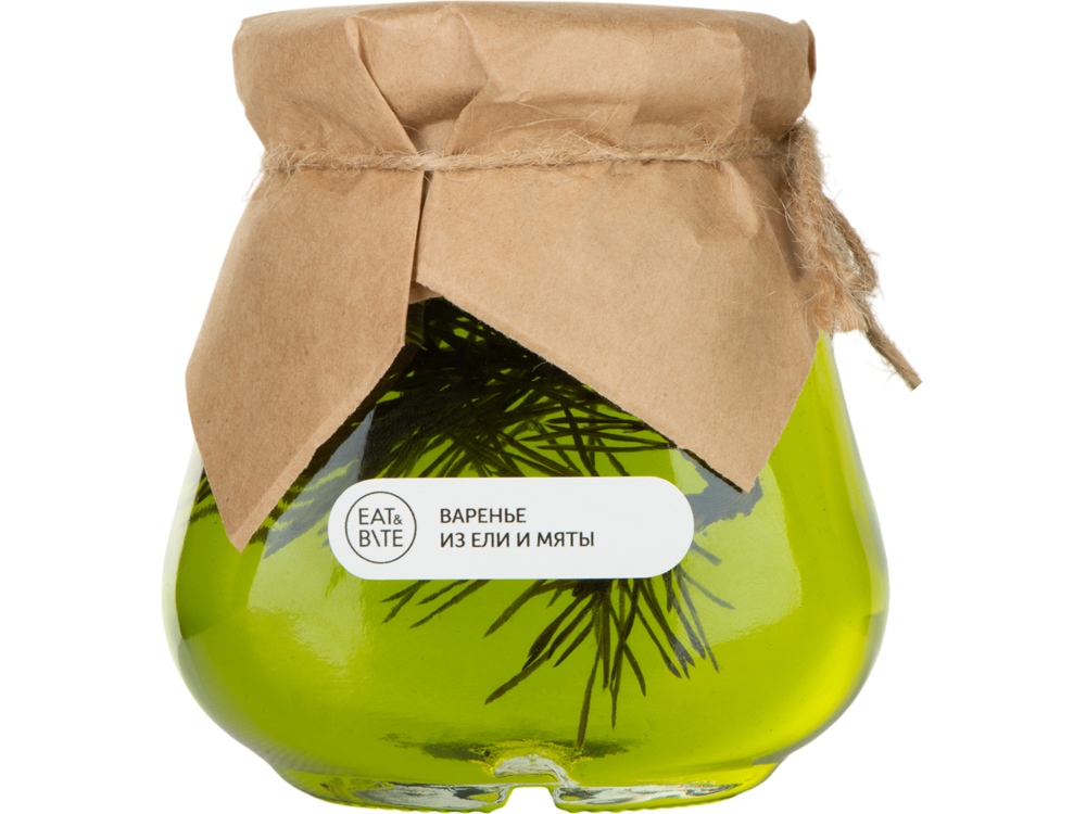 Мы привыкли, что варенье варят из фруктов и ягод. Поэтому рецепт варенья из ели выглядит достаточно необычно. Мята в сочетании с ароматом ели – это вкусный и необыкновенно полезный продукт. Варенье из ели и мяты можно добавлять в различные коктейли, что будет придавать пикантность напитку. Этот вкусный подарок поможет прогнать усталость от дневных забот. Банка варенья обернута крафт-бумагой, на которую возможно сделать нанесение корпоративного логотипа.