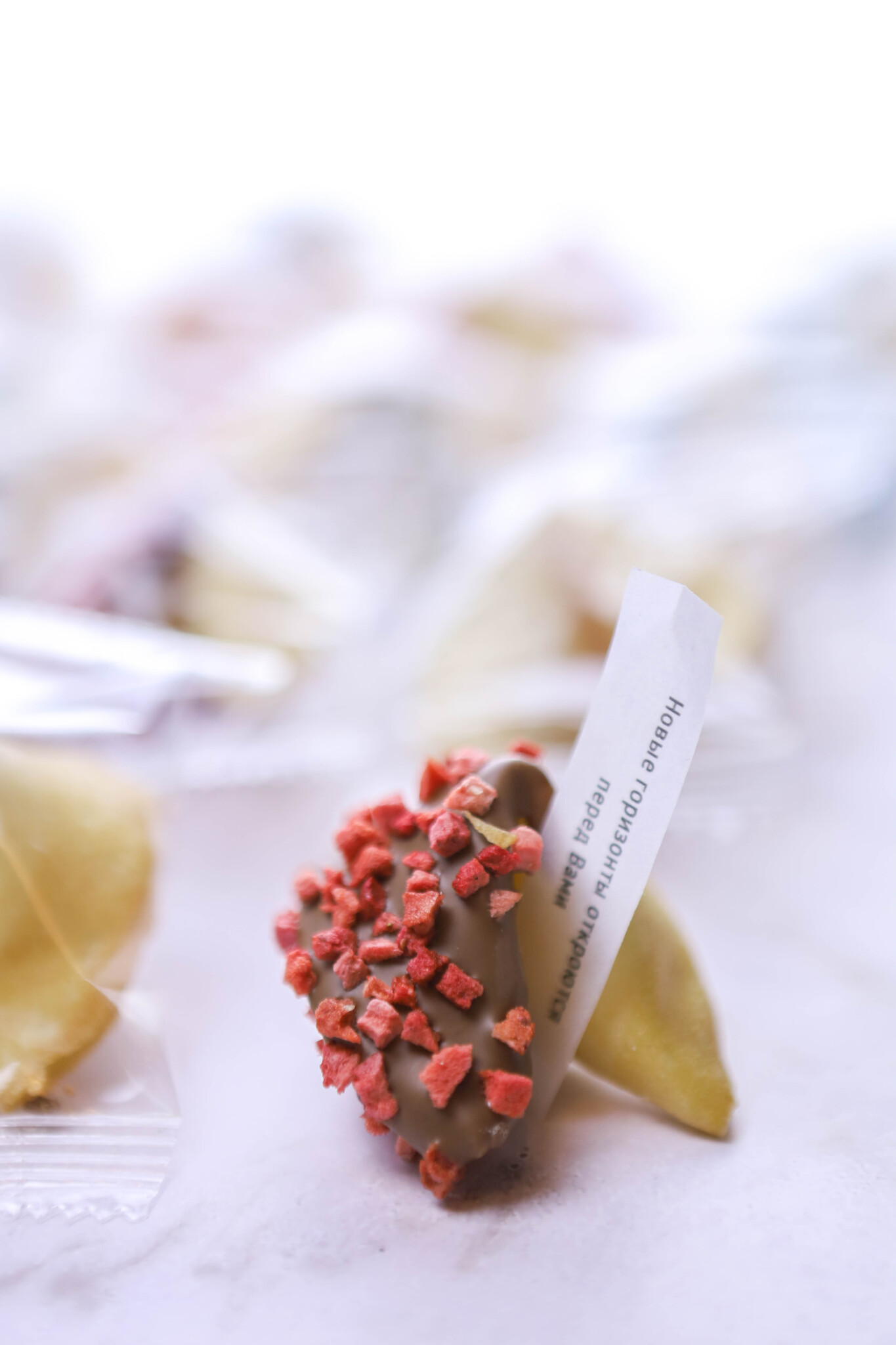 Хрустящее печенья, сладкая глазурь, красивый декор и бумажка с предсказанием внутри. Печенье покрывается глазурью разного цвета.