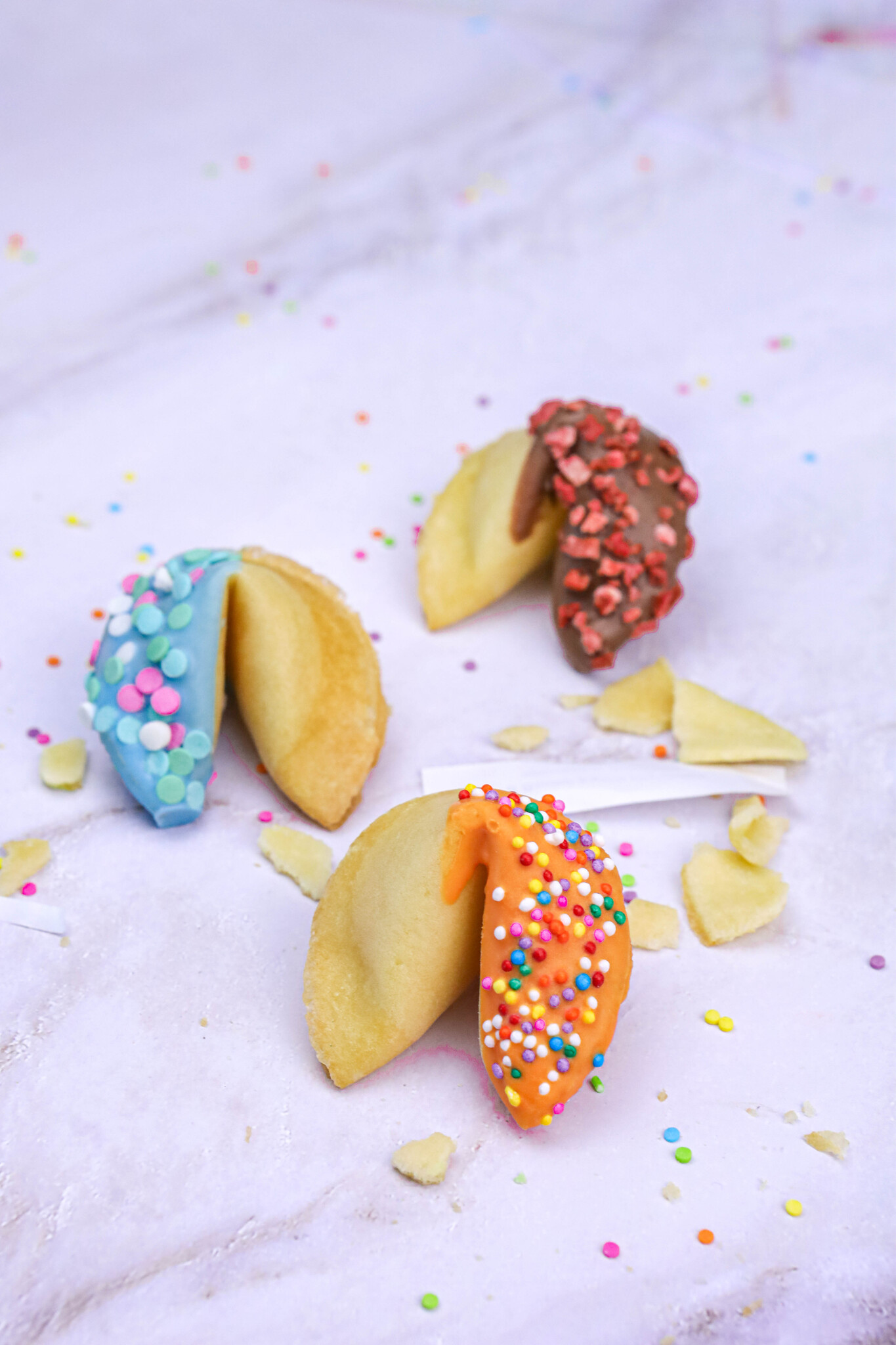 Традиционное печенье с предсказаниями покрытое цветной глазурью и декором на ней.