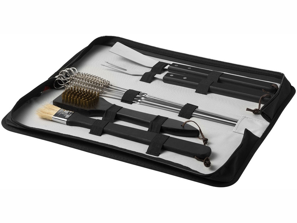 Набор для барбекю Asado из 11 предметов. Набор для барбекю включает лопатку для рыбы, кисть, вилку и щетку для очистки с деревянными ручками, шесть шампуров и чехол на молнии с передним карманом для нанесения. Нанесение не предлагается на отдельные элементы набора. Нержавеющая сталь и полиэстер 600D.
