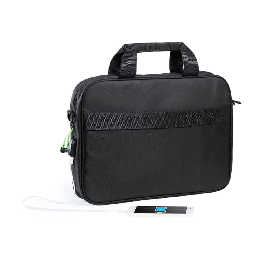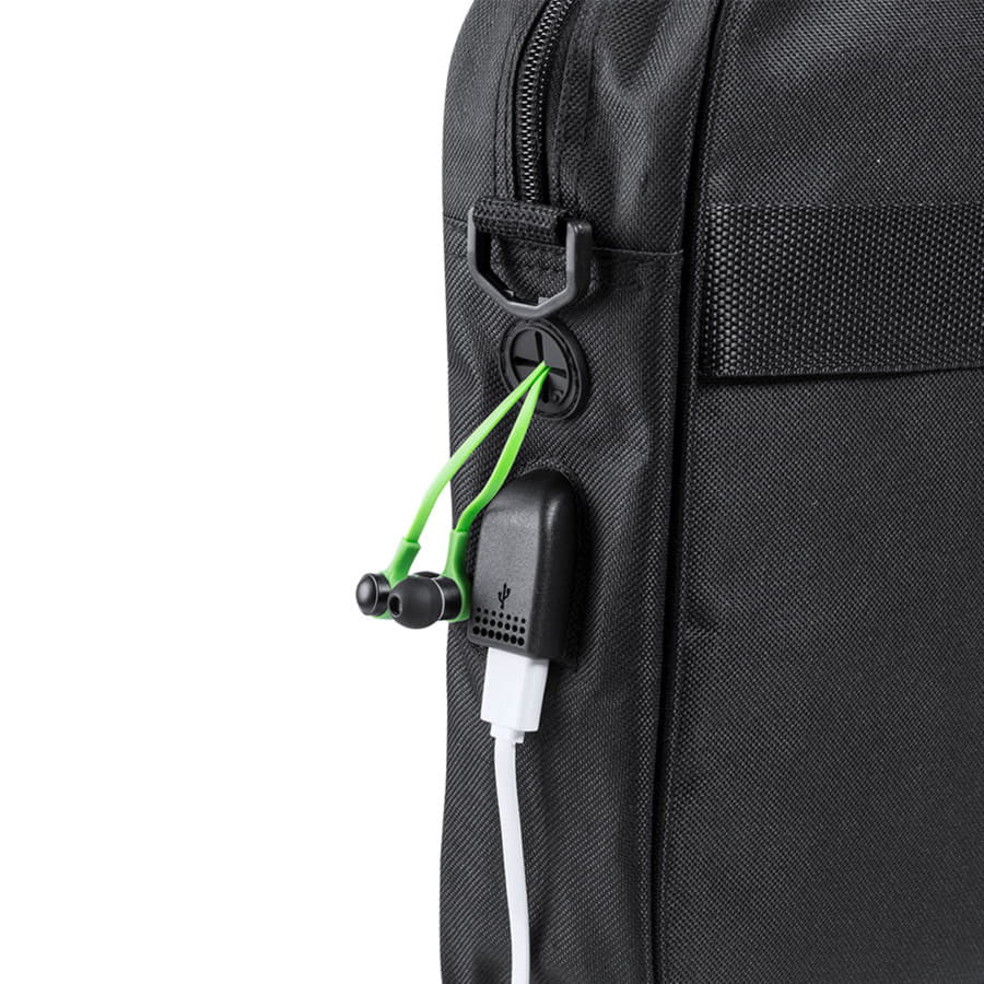 Сумка для документов из прочного полиэстера 600D с черным покрытием и застежкой-молнией. С выходом для наушников и внутренним отсеком с USB-портом для подключения powerbank (не входит в комплект). С прочными усиленными ручками и регулируемым ремнем. Внутри есть отделение с мягкой подкладкой для ноутбуков до 15 дюймов и отделение для планшетов до 10 дюймов.