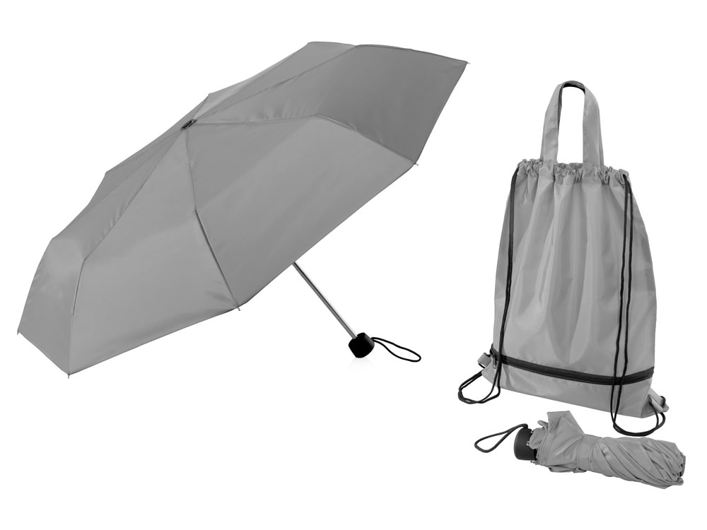 Механический зонт с прорезиненной ручкой идет в комплекте с сумочкой для покупок. На дне сумочки предусмотрен карман на молнии, в котором вы можете хранить зонт дома или прятать в него мокрый зонт, когда вы попали под дождь. Находясь в кармане сумочки, мокрый зонт не доставит неудобств. Сумочка имеет 2 варианта использования: шопер с двумя 2 ручками и рюкзак-мешок со шнурками.