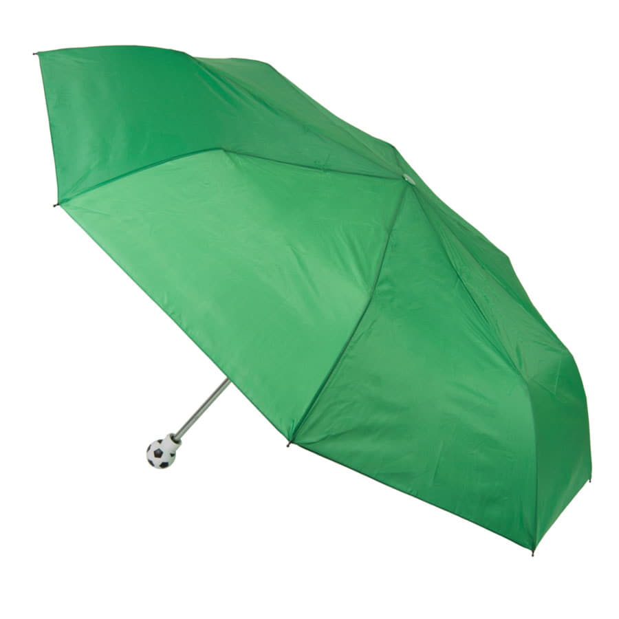 Зонт складной, 3 сложения, механический.Диаметр купола: 105 см., длина в сложенном состоянии 27 см.Состав купола: 100% полиэстер 190T.Состав стержня: металл.Состав спиц: металл + стекловолокно.Ручка: пластик в виде футбольного мяча.Цвет купола: близкий к пантону 348C.              Зонт упаковывается в футляр из основного материала.(при желании футляр можно убрать в ручку зонта).