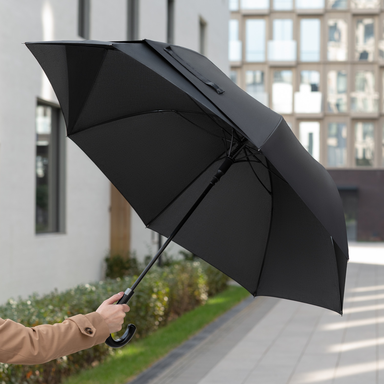 Прочная конструкция «антишторм» с гибкими спицами из стеклопластика защищает зонт от поломок при сильном ветре. Водостойкий купол изготовлен из эпонжа 190Т, быстро высыхающего после использования.