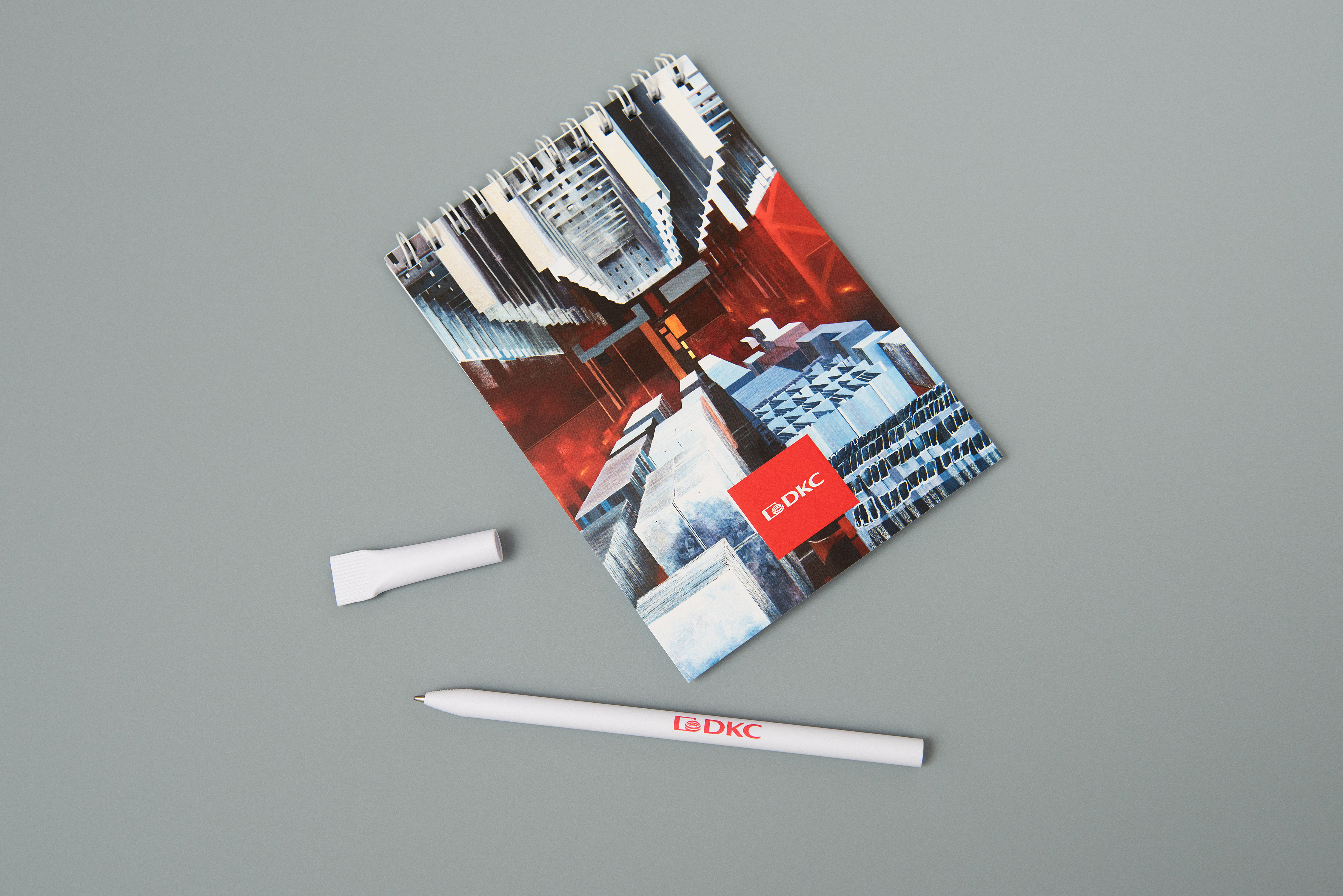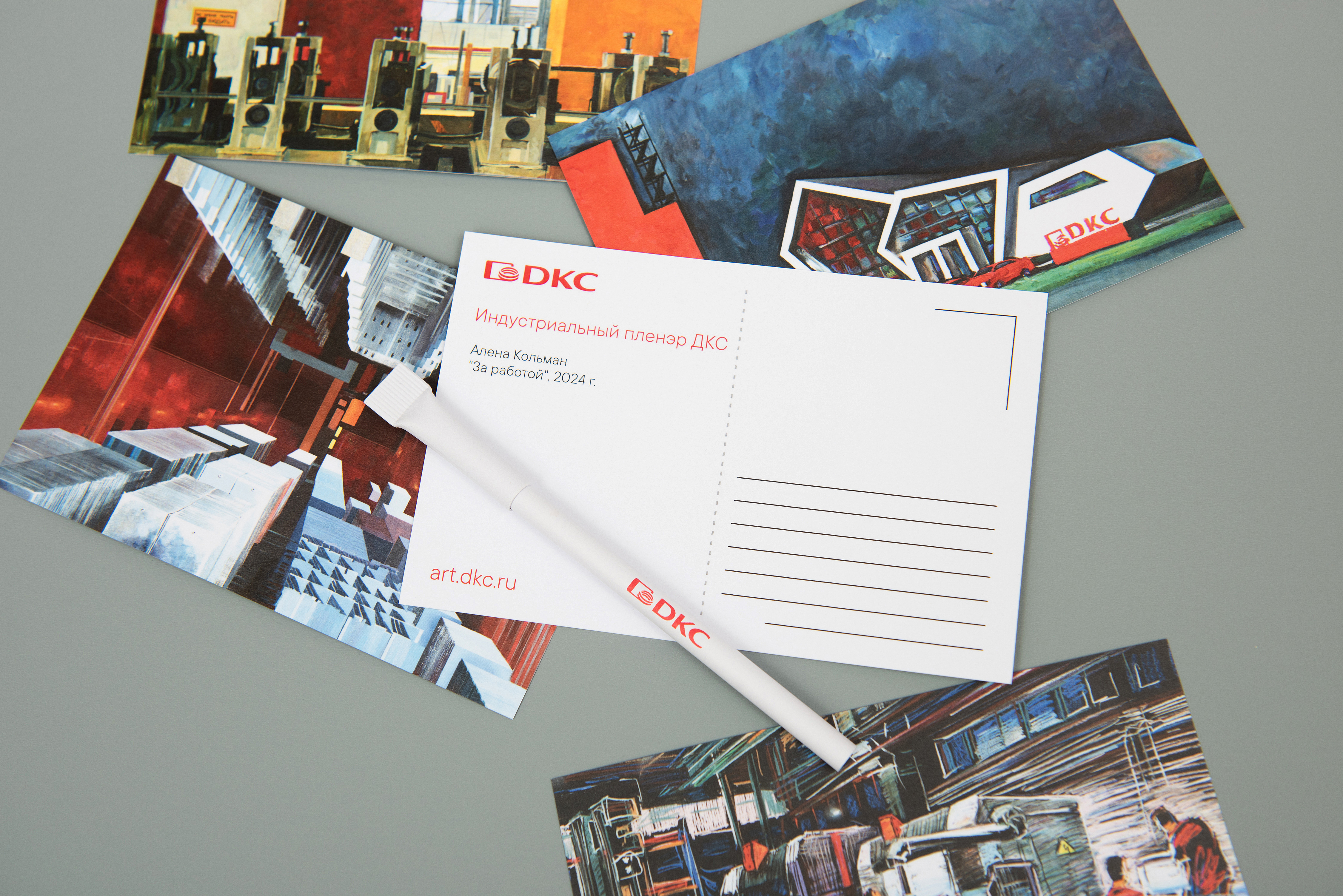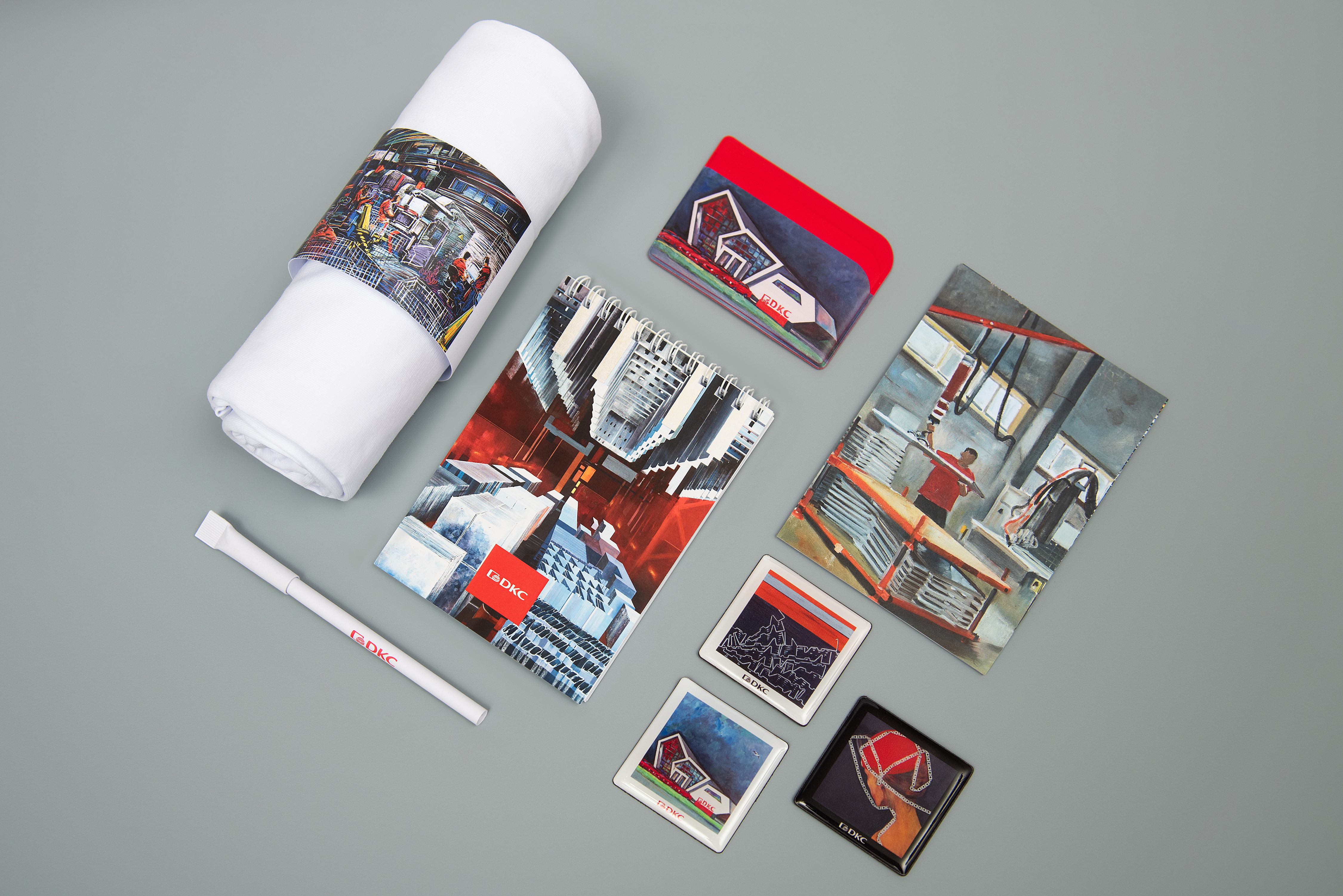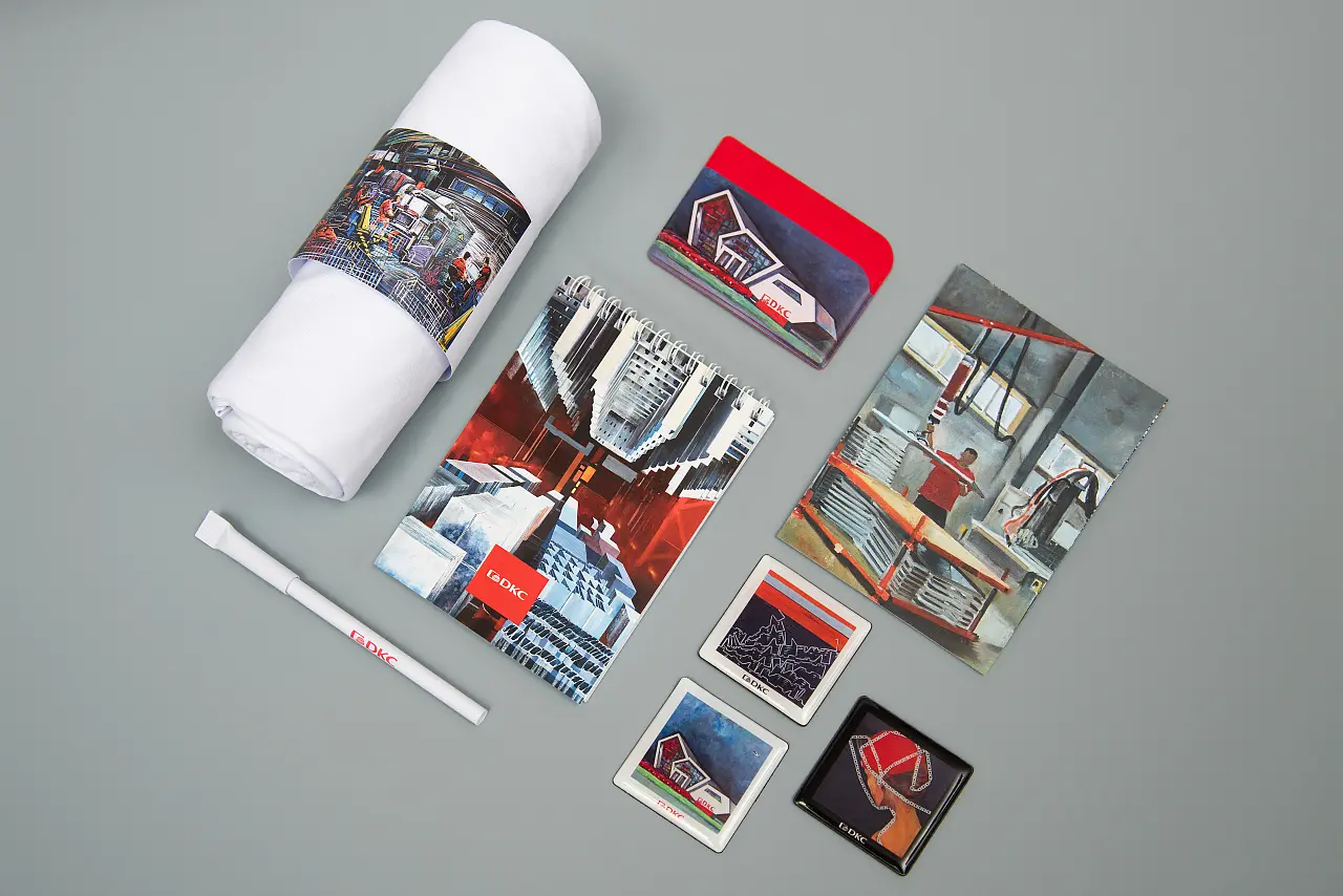 Для компании ДКС мы подготовили сет мерча для мерчшопа. Мерчшоп — это фирменный магазин, в котором собрана брендированная продукция компании. В дизайне товаров использовались картины художников, на которых изображено производство.